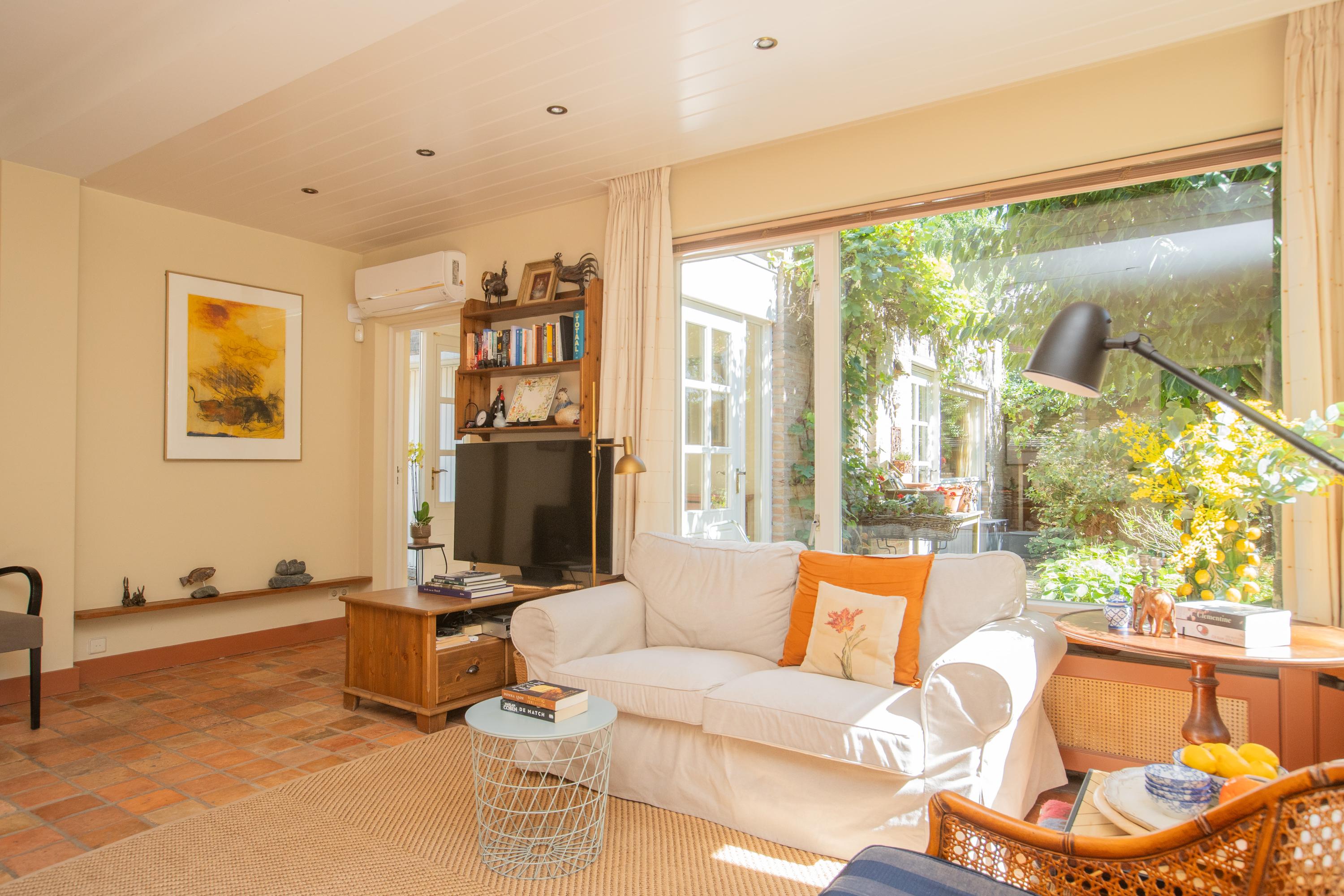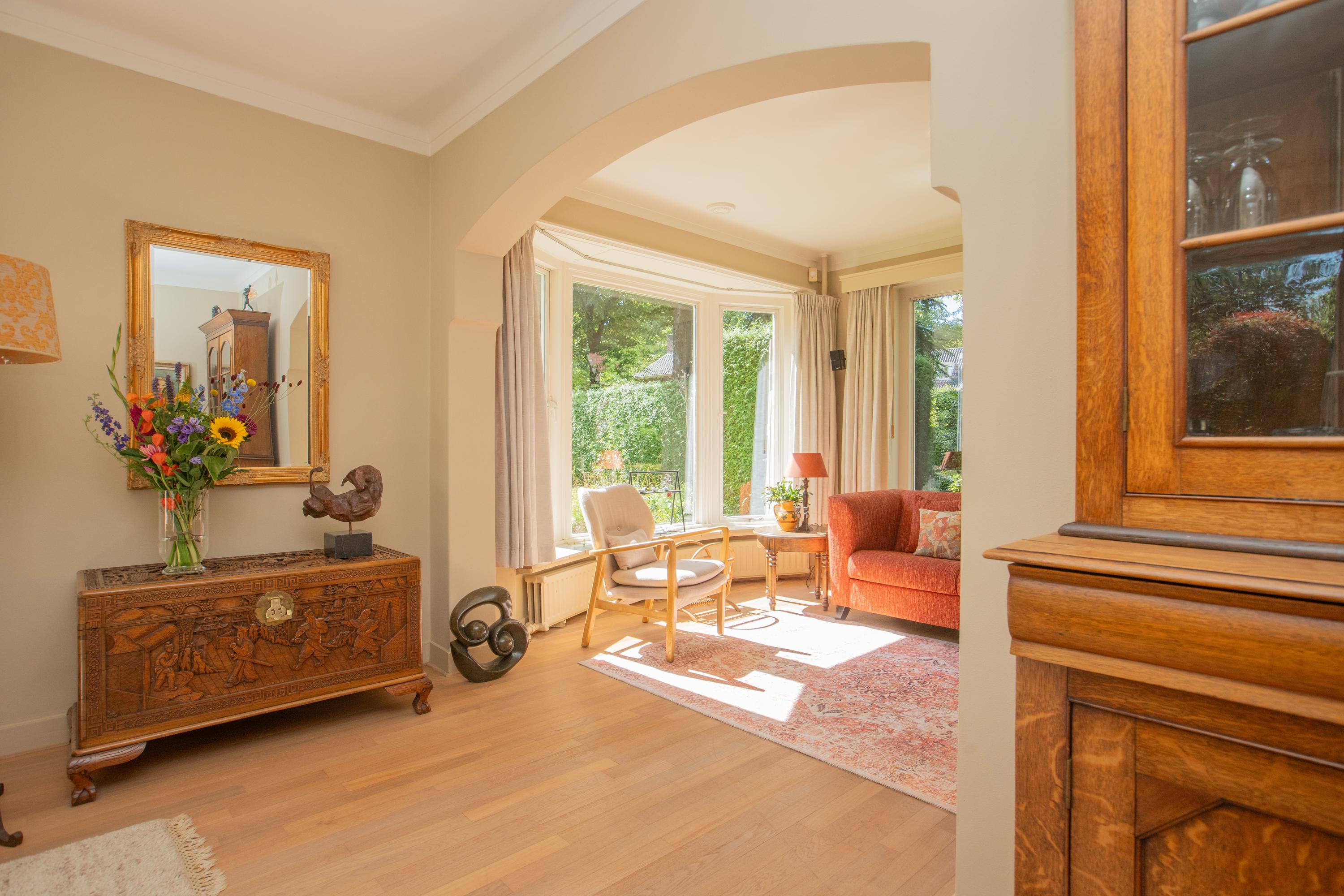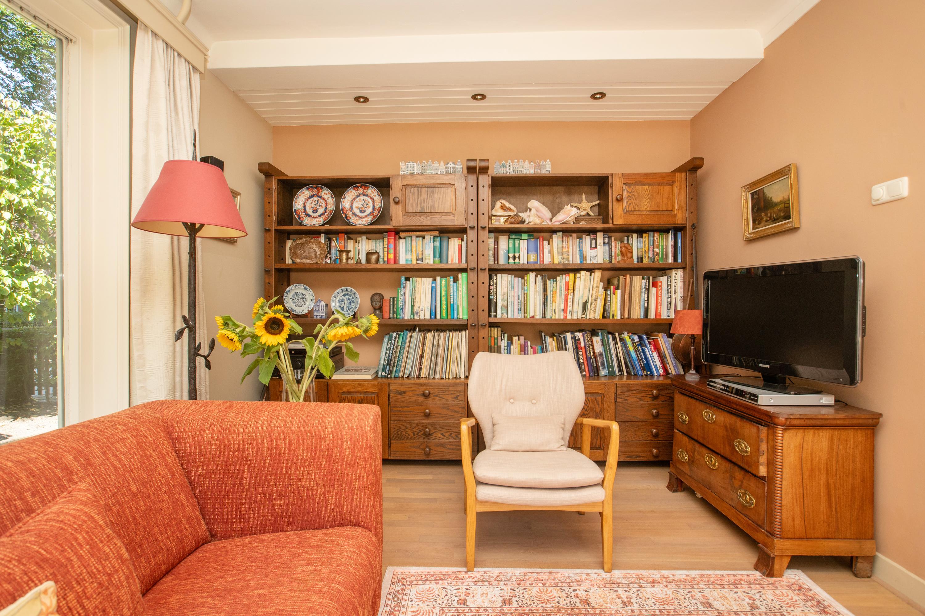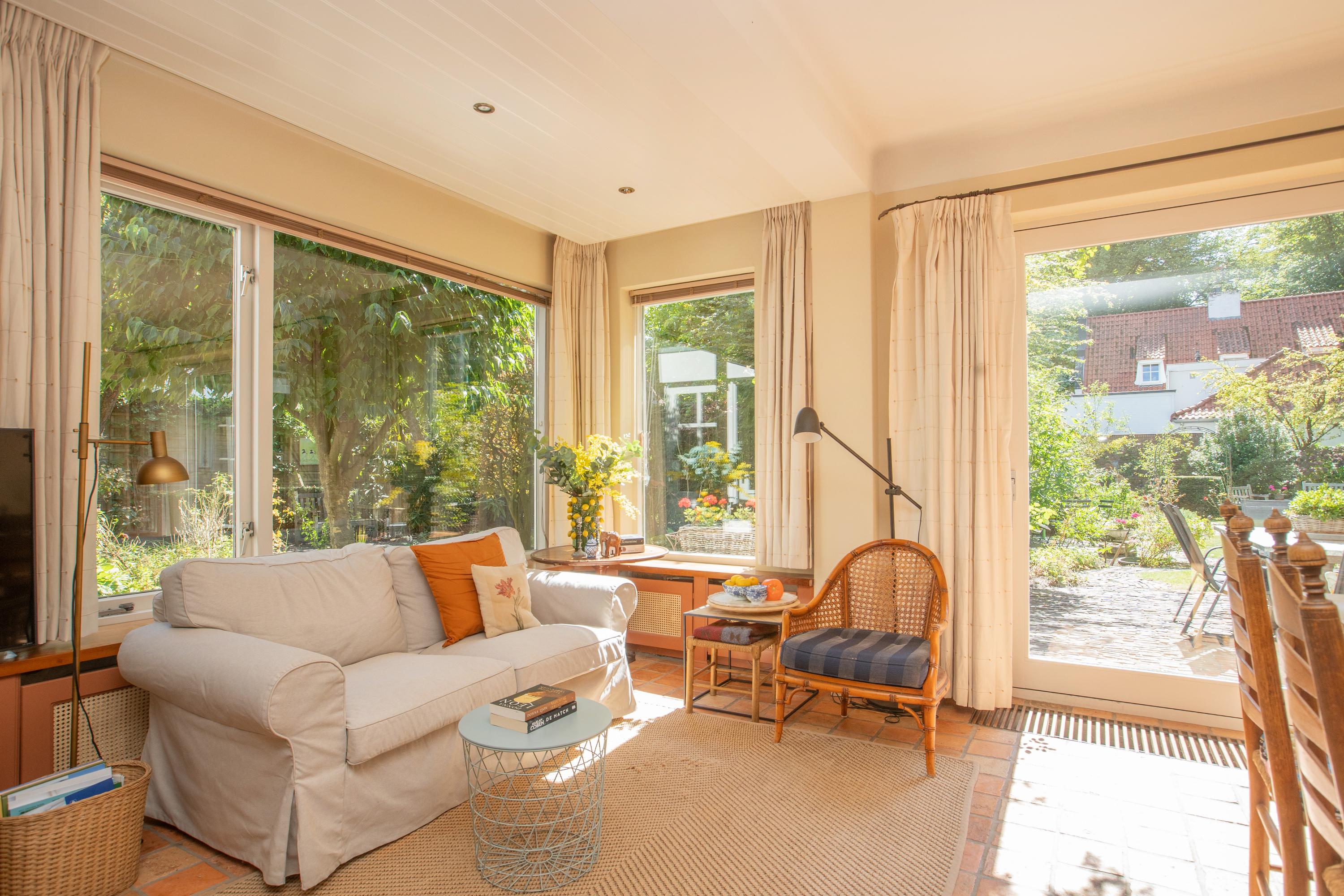 Comfortabele woonkamer met karakter en lichtinval In de woonkamer stroomt daglicht rijkelijk naar binnen, met grote ramen die zicht geven op de tuin. Deze kamer met houten parketvloer heeft twee zitgedeeltes en een gezellige open haard. Is het karakteristieke deurtje rechtsboven de haard opgevallen? Dit was ooit een pijpenkastje van de allereerste bewoner. De gezelligheid uit de keuken verplaatste zich vaak naar de woonkamer. Eveneens een heerlijke ruimte voor samenzijn, maar ook voor afzondering wanneer dat gewenst was. De screens en markiezen zorgen voor comfort op warme dagen.