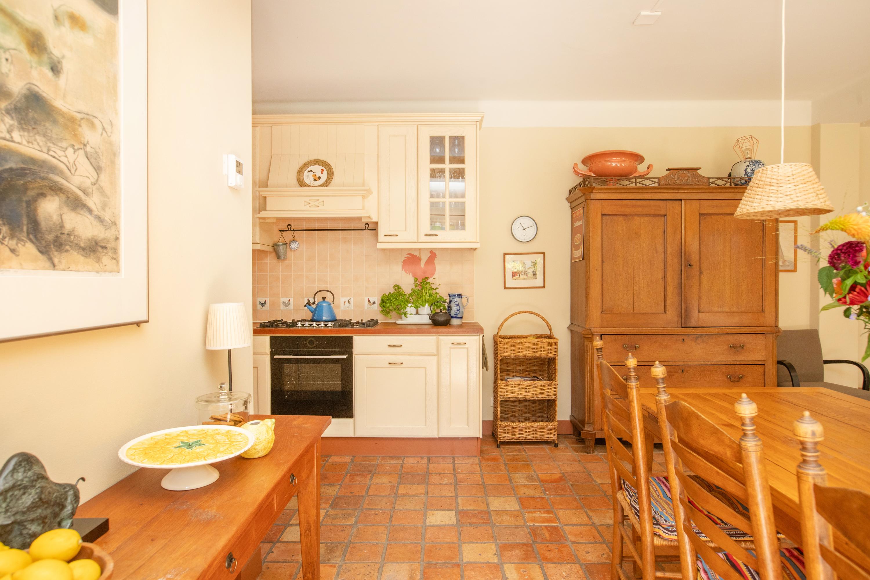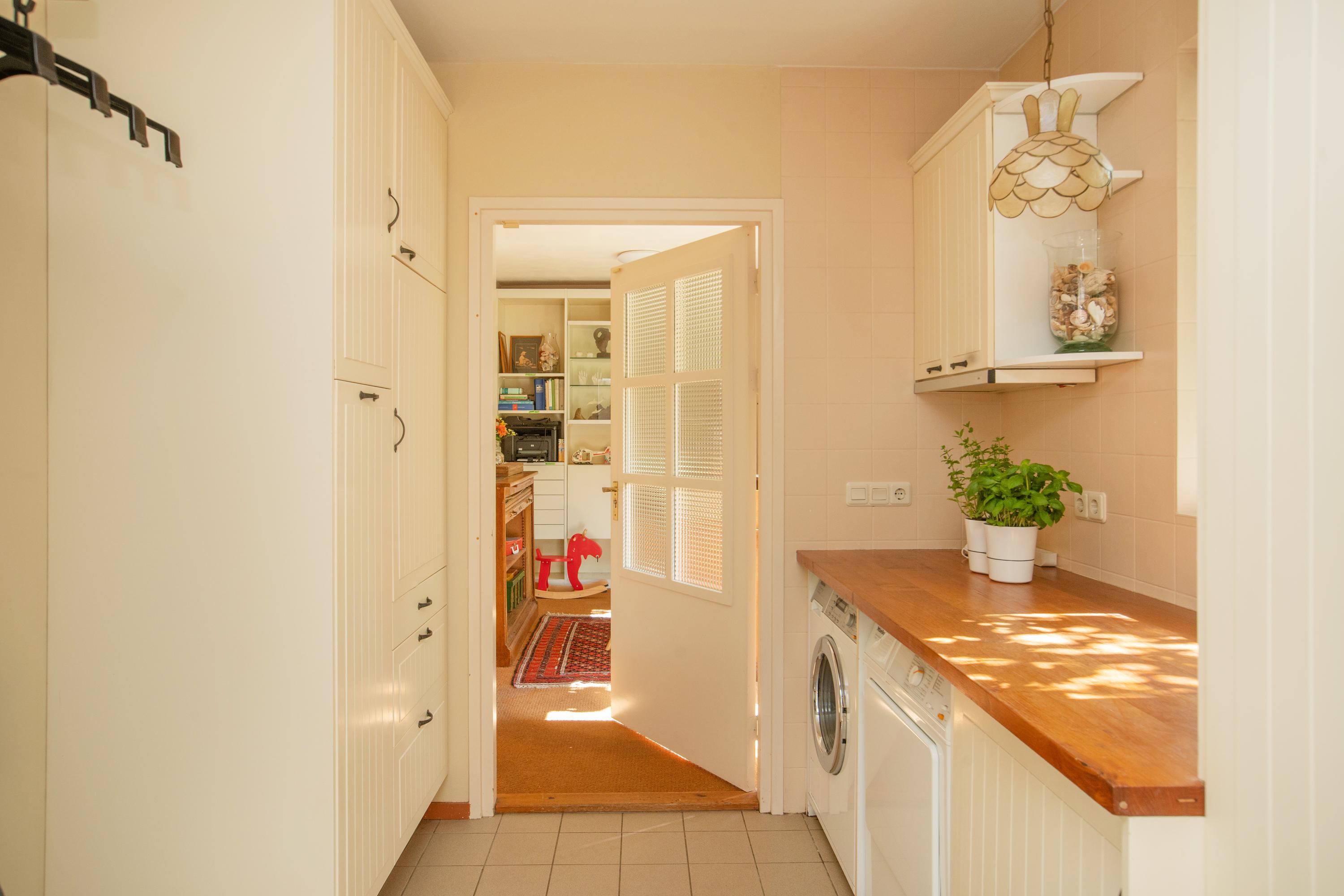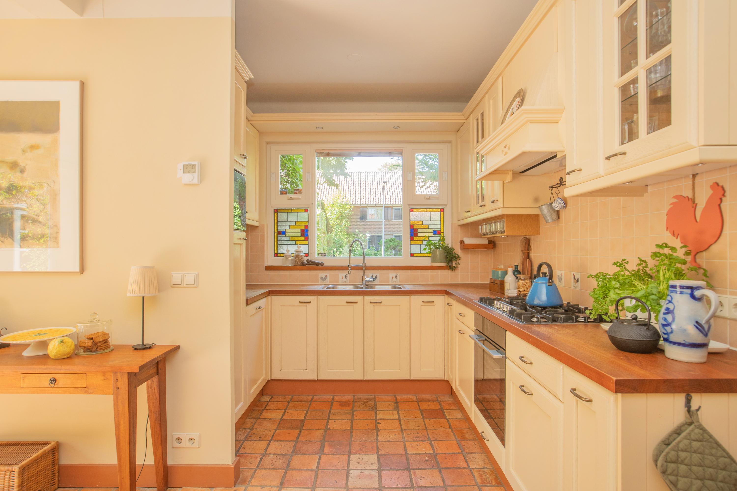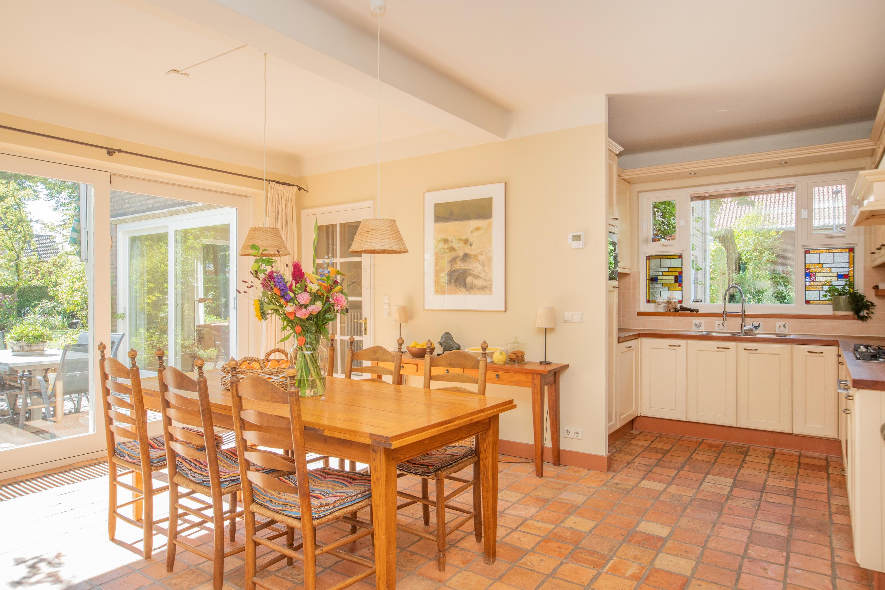 Centrale woonkeuken met toegang tot tuin en bijruimtes De grote woonkeuken is het kloppend hart; een ruimte die leeft en waar iedereen altijd samenkwam. Hier werd gekookt, gespeeld en gezeten aan de lange eettafel waar plek was voor twaalf. Met de schuifpui wagenwijd open op mooie dagen, zodat je de prachtige tuin naar binnen haalde. Airconditioning zorgt hier voor extra comfort bij warmte en kou, want de unit kan zowel koelen als verwarmen. De keuken is uitgerust met een groot fornuis, een oven, een combimagnetron, een vaatwasser, een carrouselkast voor pannen en veel kastruimte. In de aangrenzende bijkeuken, met aansluitingen voor wasapparatuur, is extra bergruimte en toegang tot zowel de tuin als de oprit. Aansluitend ligt de voormalige studeerkamer en daarachter de inpandige garage. Boven de keuken bevindt zich een extra berging, bereikbaar via een luik aan de buitenzijde van het huis.