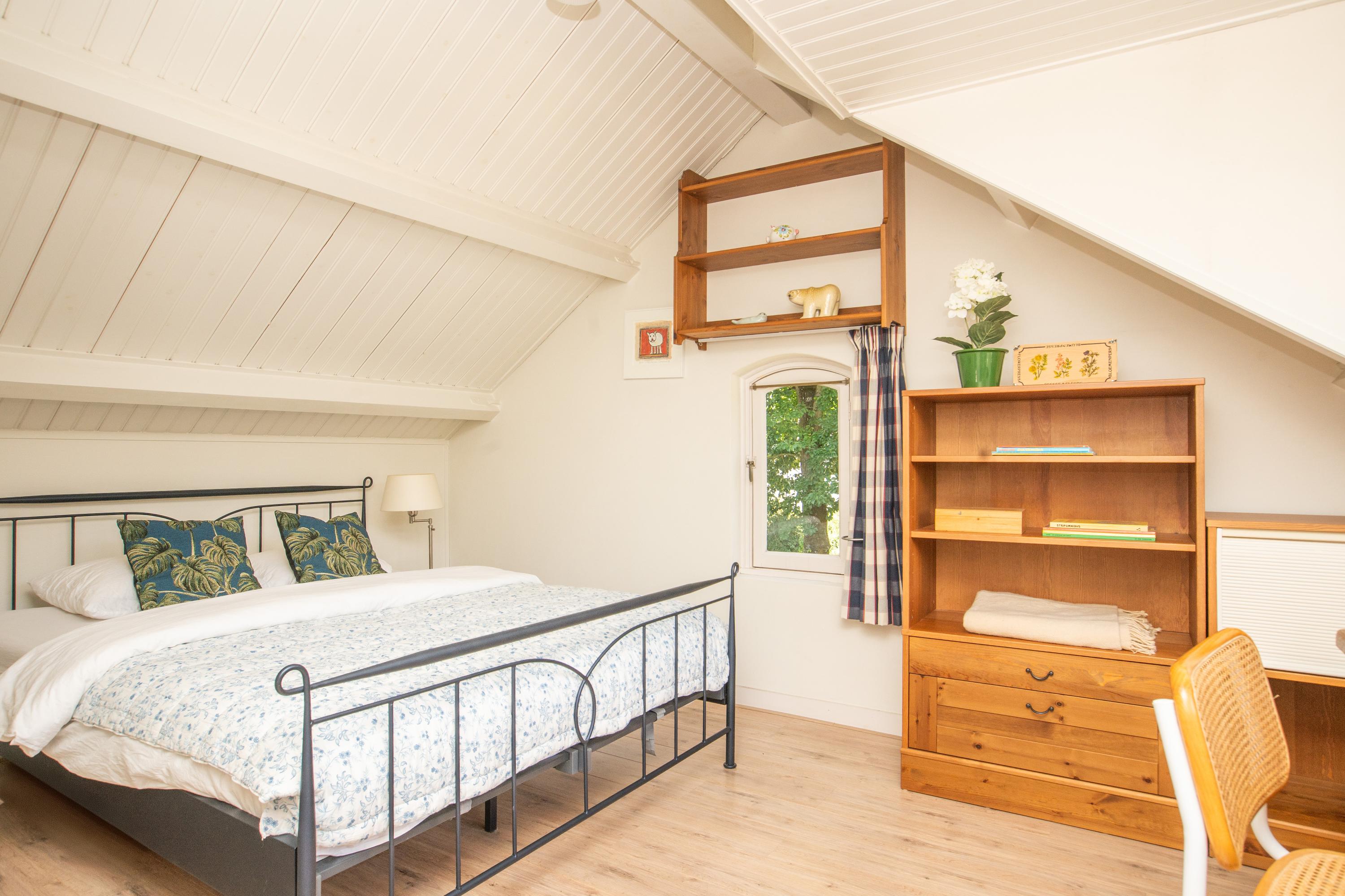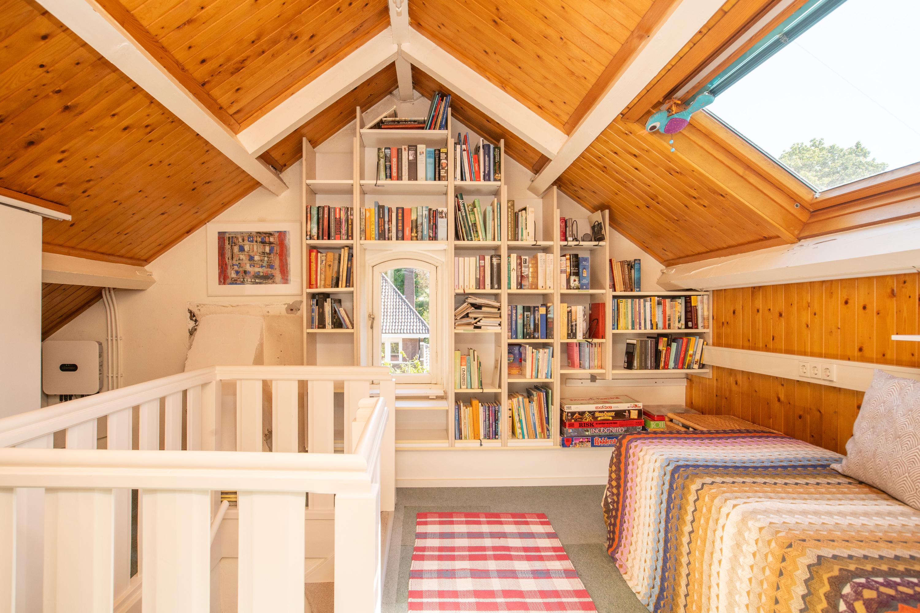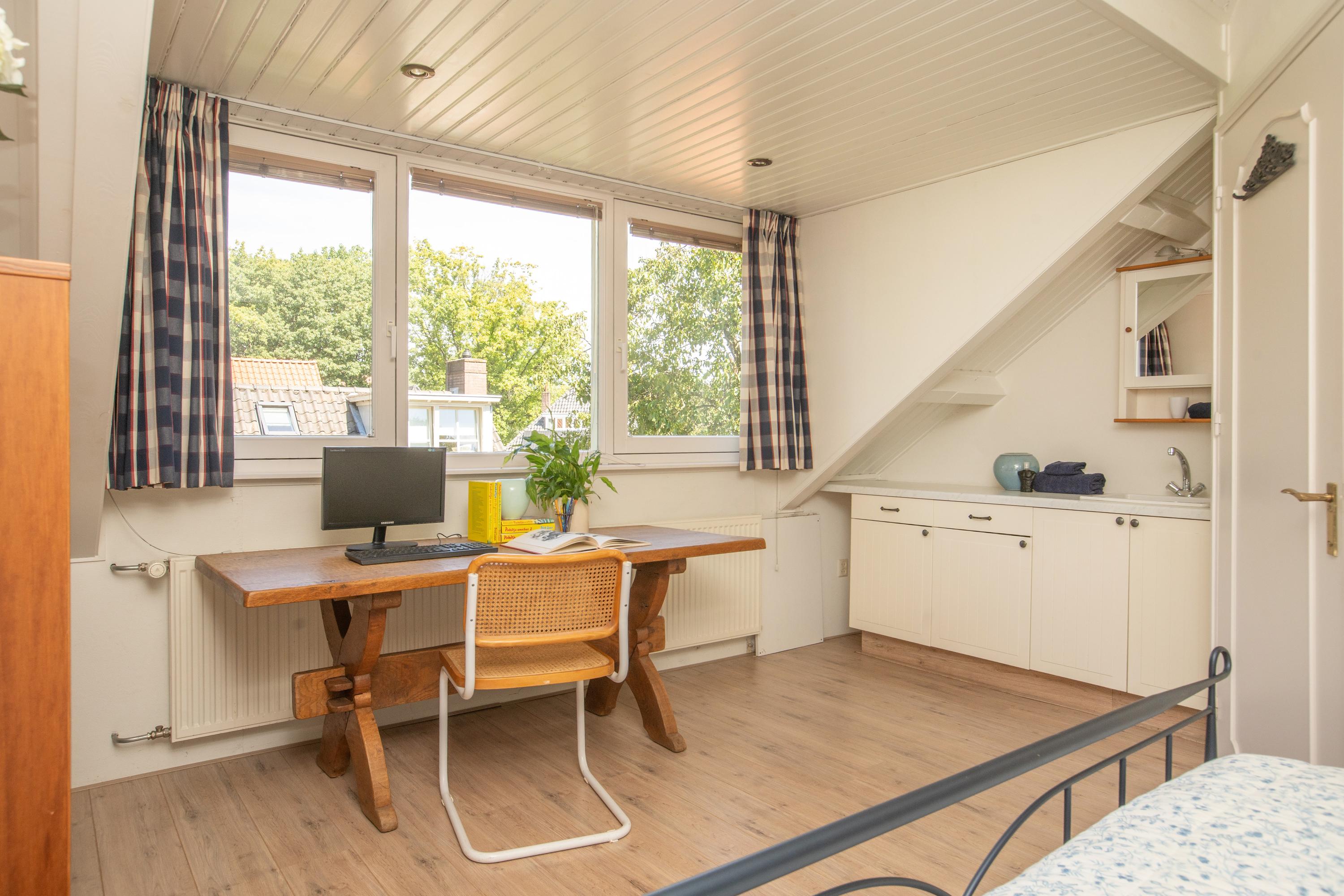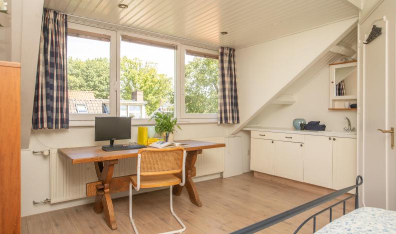 Zolder met mogelijkheden De zolder is bereikbaar via een vaste trap en verdeeld in twee kamers. De eerste kamer heeft een dakraam en een karakteristiek rond raam (enkel glas), er is bergruimte in de knieschotten en een speelse indeling onder het schuine dak. De tweede kamer heeft een dakkapel, een keukenblok met wastafel en ruimte voor een tweepersoonsbed. Een volwaardig appartement dus met volop licht. Perfect als studio voor oudere kinderen, logees of te gebruiken als hobbyruimte.