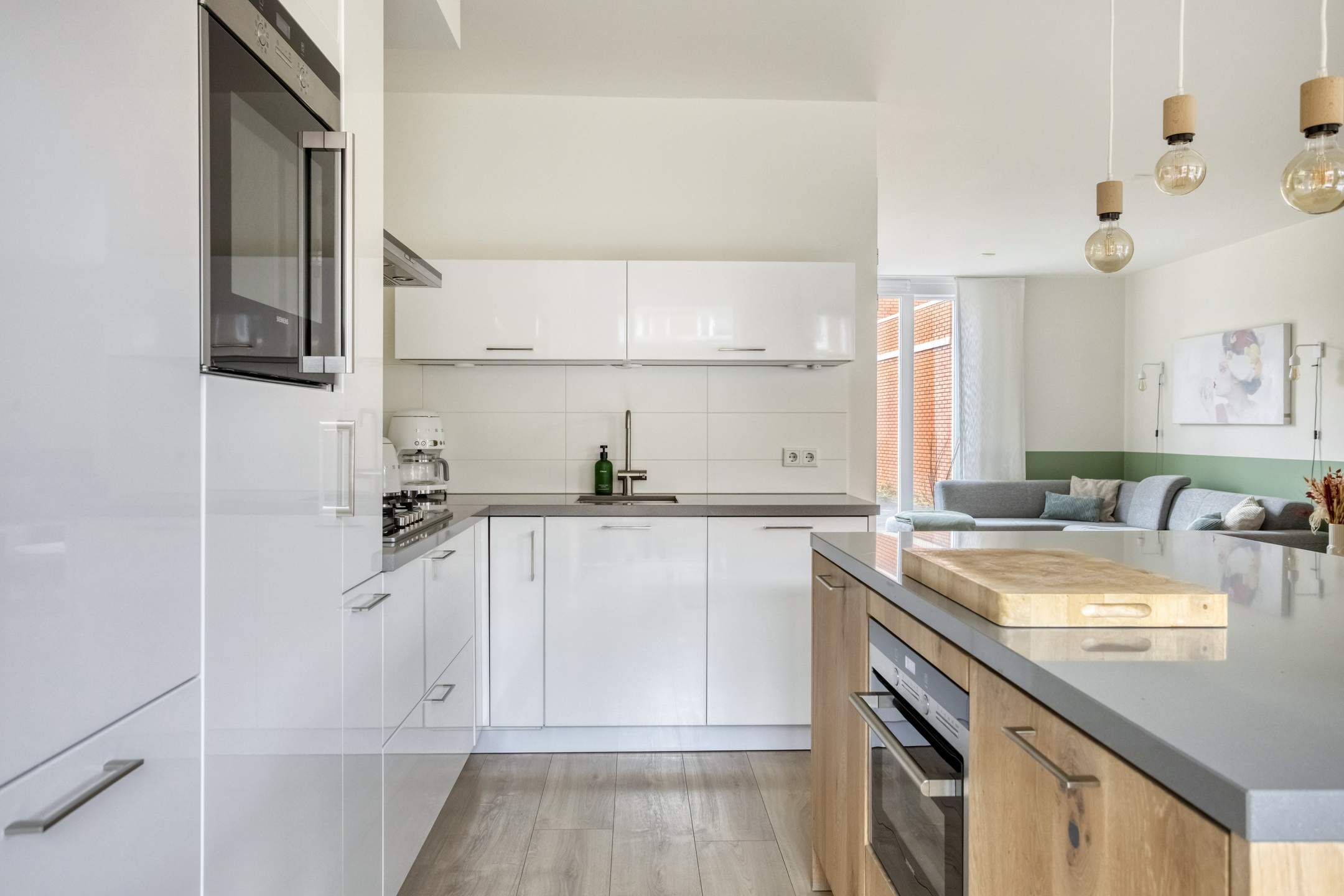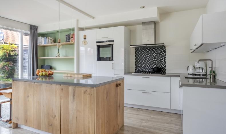 Keuken: Grenzend aan de eetkamer vindt u de moderne open keuken. Deze is voorzien van een L-vormig aanrecht en kookeiland voor extra werk- en opbergruimte. De keuken is compleet met gasfornuis, afzuigkap, spoelbak met kraan, vaatwasmachine, ingebouwde oven en ovencombinatie en een koelkast. Door alle voorzieningen wordt koken hier zowel praktisch als plezierig.