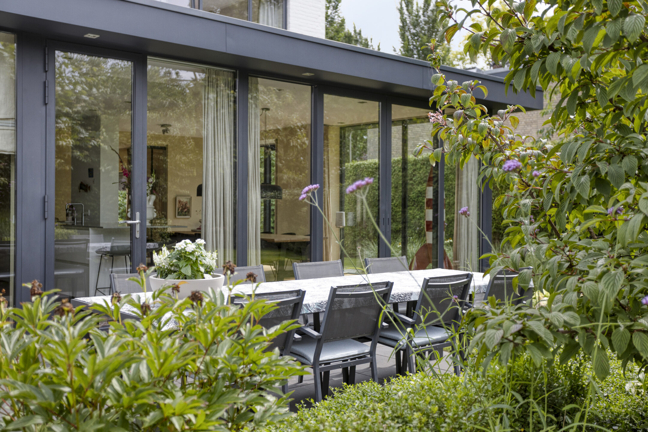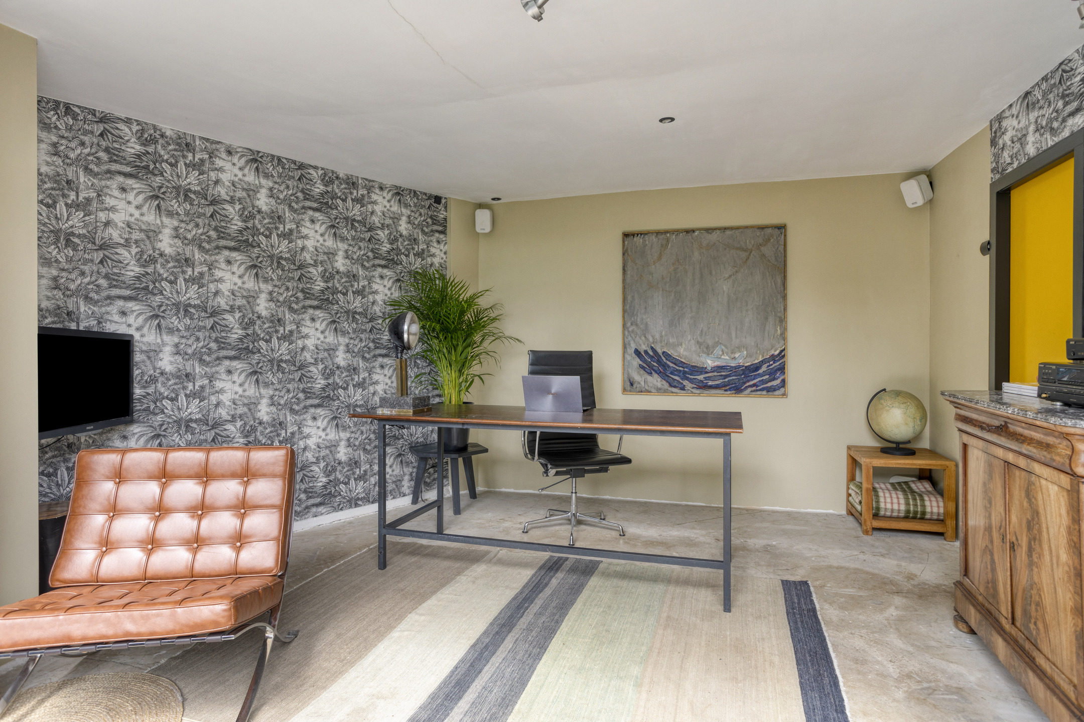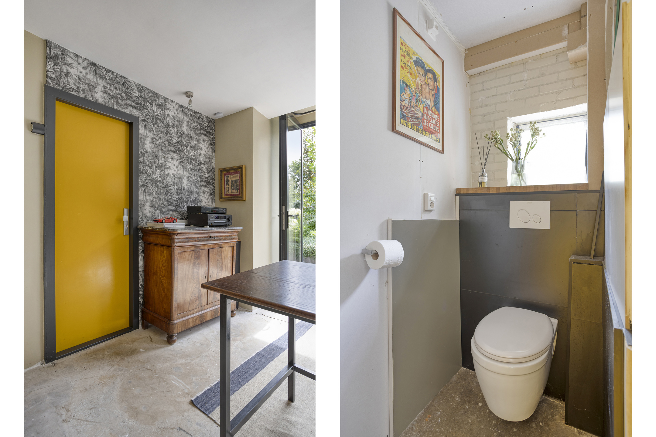 Aan de achterzijde bevindt zich een tuinkamer met een harmonicadeur, veel daglicht en een toilet. Deze ruimte is in gebruik als werkplek, wordt ook gebruikt als chillplek en leent zich net zo goed voor een atelier of wellnessruimte.