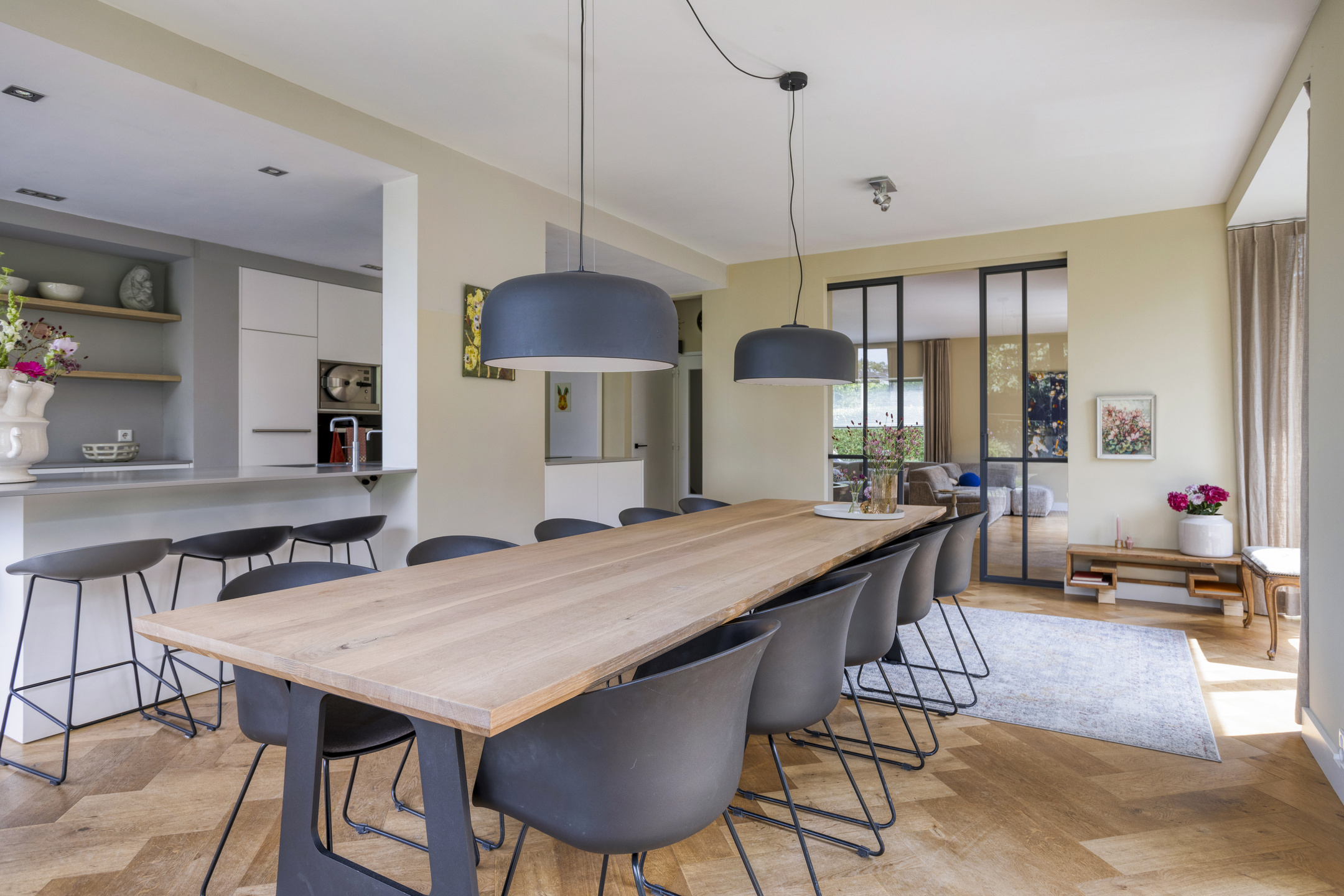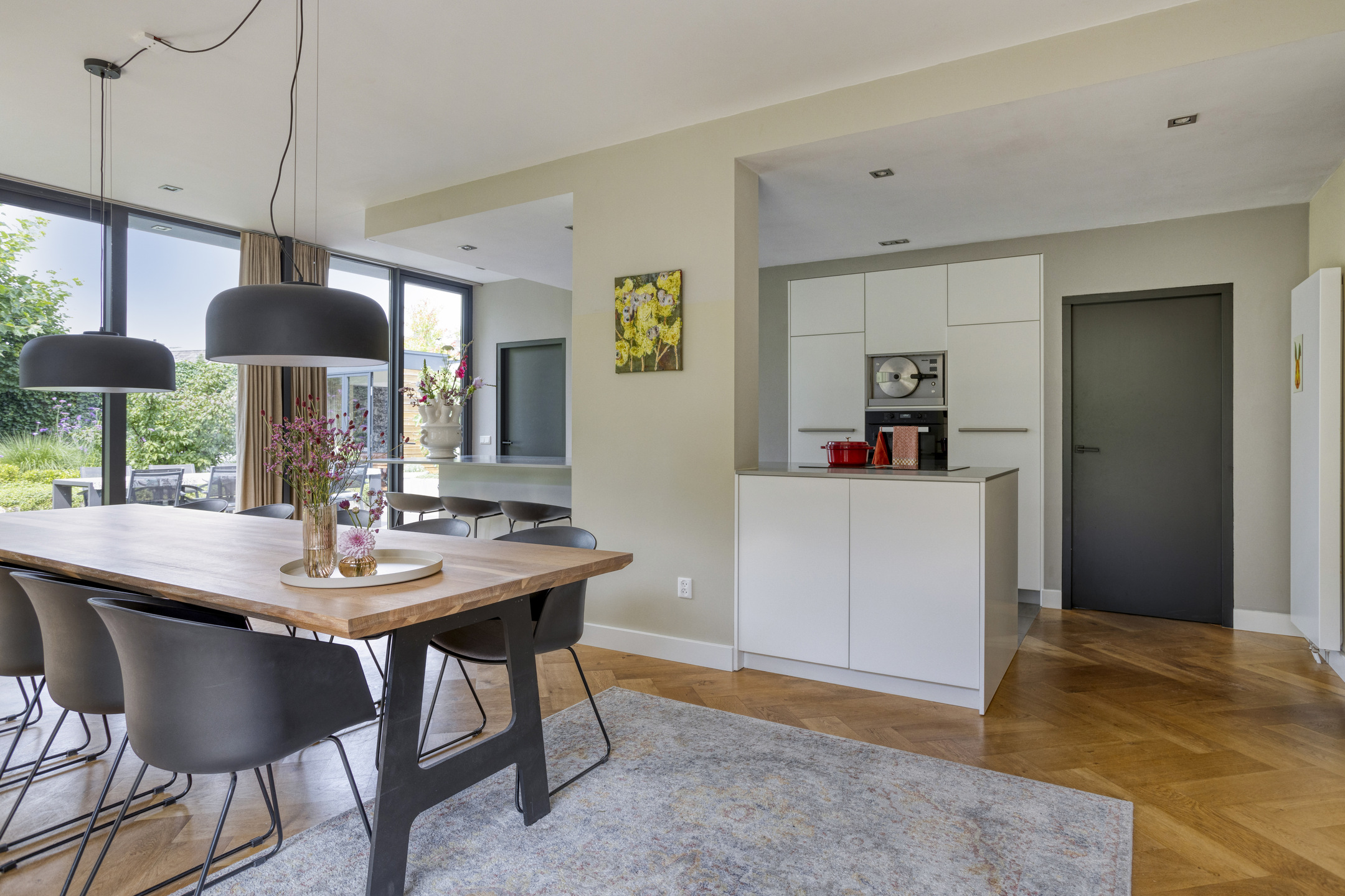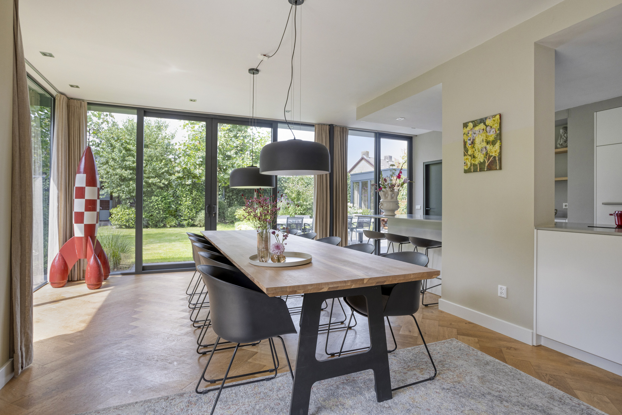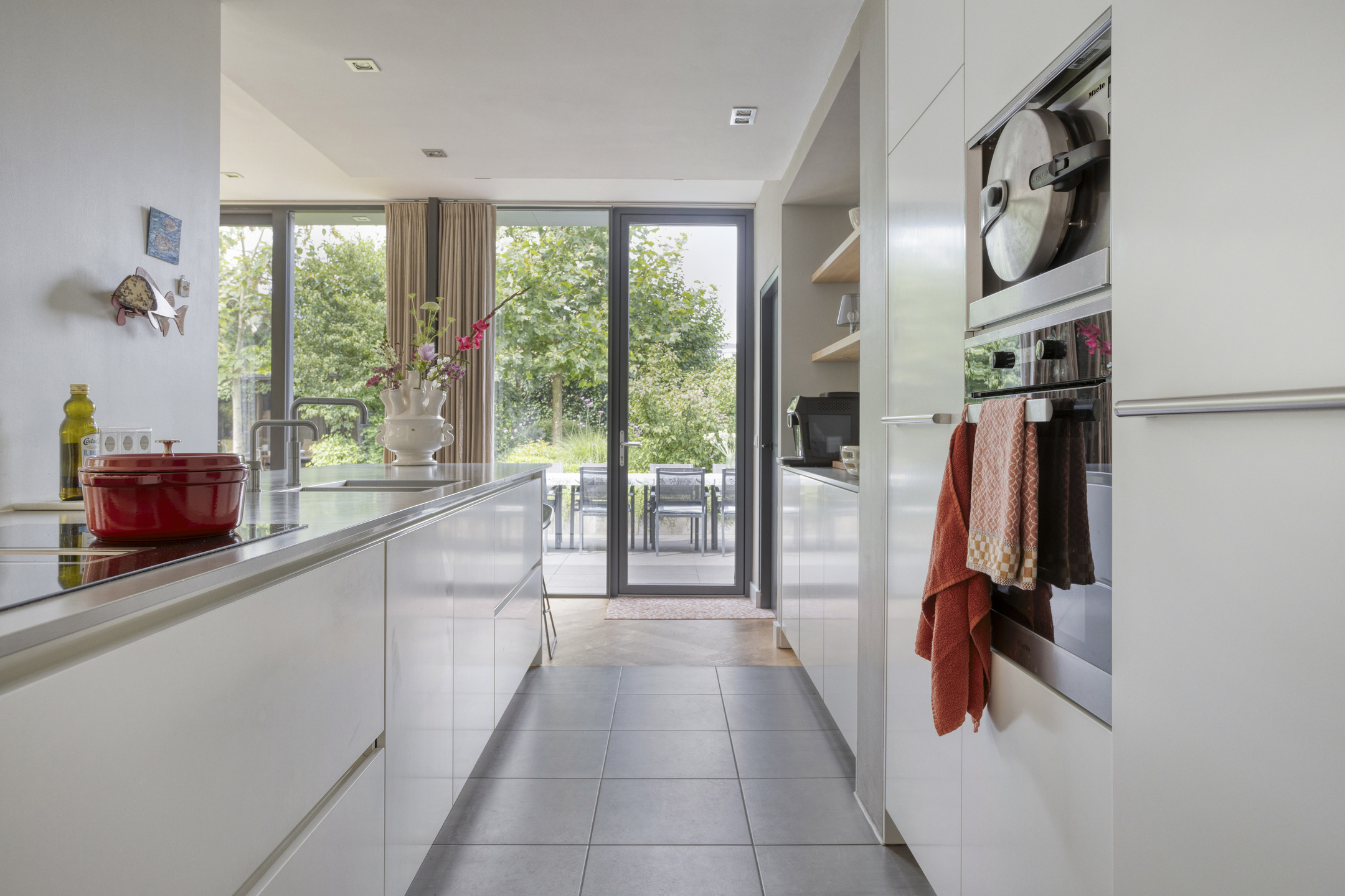 Keuken als middelpunt van het huis De woonkeuken is een lichte, ruime plek waar binnen en buiten moeiteloos in elkaar overvloeien. Twee grote schuifpuien verbinden de keuken direct met de tuin, waardoor deze ruimte aanvoelt als een natuurlijk verlengde van het buitenleven. De keuken is praktisch en ruim opgezet, met een rank werkblad, veel werkruimte en opvallend veel kastruimte in de vorm van lades en kasten, ook aan de achterzijde van het eiland. Aan het eiland staan barkrukken. Hier wordt gekookt, gezeten en geleefd. De inrichting is afgestemd op intensief gebruik, met hoogwaardige inbouwapparatuur zoals twee ovens (waaronder een hogedrukstoomoven), een biofresh-koelkast, een inductiekookplaat met geïntegreerde afzuigkap die ondergronds naar buiten afzuigt. Twee Quookers: één voor kokend water, één voor warm en koud. De vloer is van eikenhout; tussen het kookeiland en de wand met apparatuur liggen tegels. De benedenverdieping is in 2024 opnieuw geschilderd; een van de voorbeelden van de zorg waarmee het huis is onderhouden.