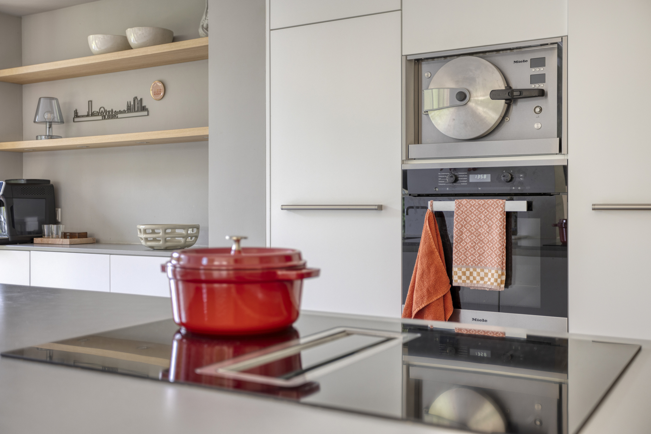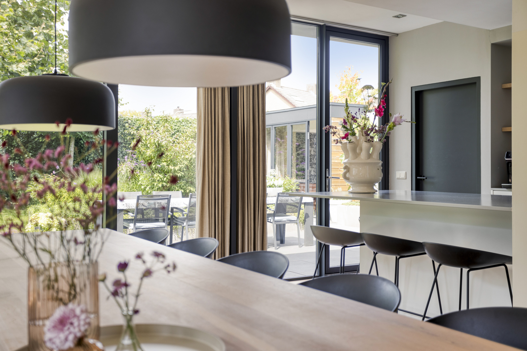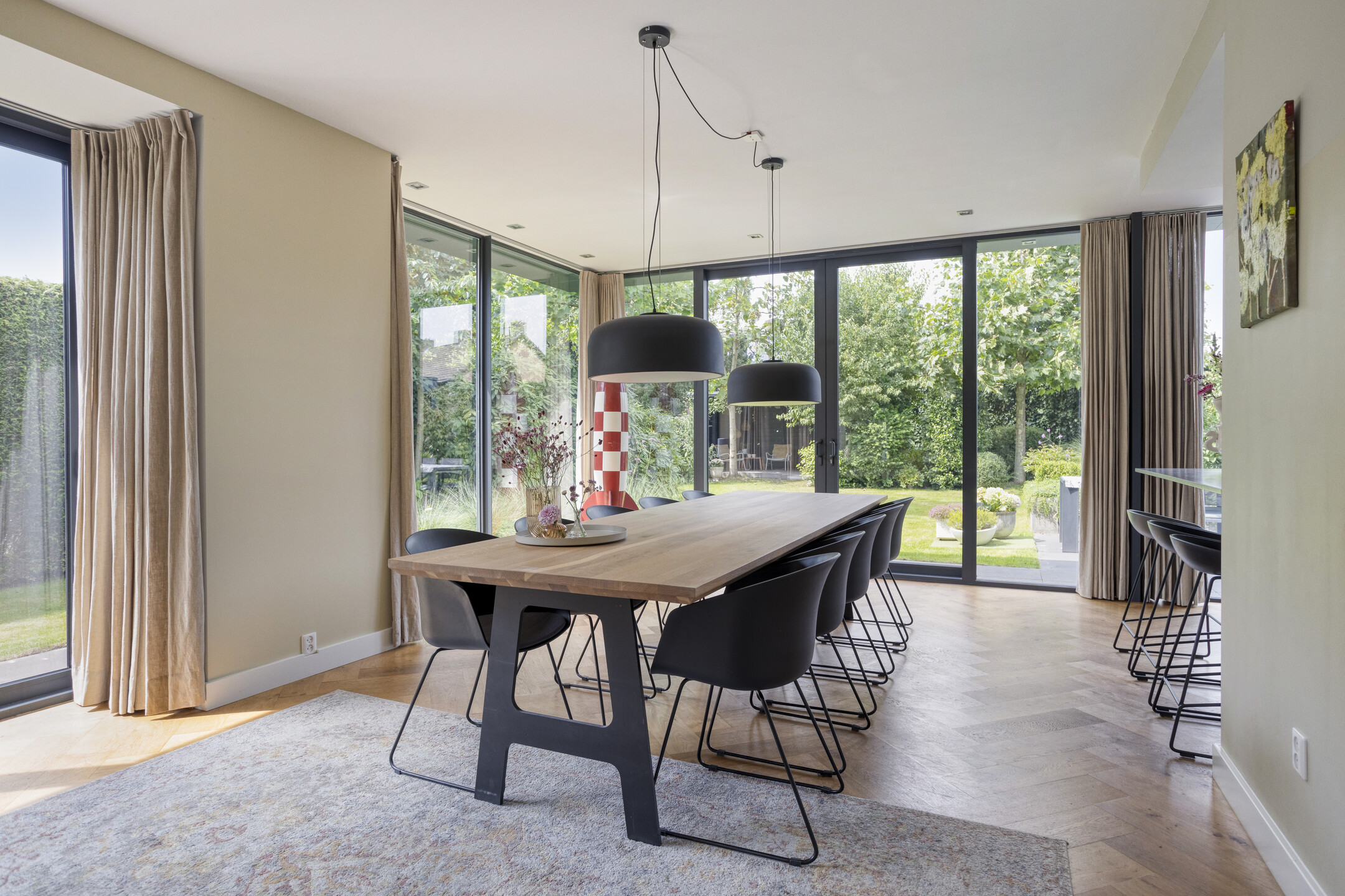 Keuken als middelpunt van het huis De woonkeuken is een lichte, ruime plek waar binnen en buiten moeiteloos in elkaar overvloeien. Twee grote schuifpuien verbinden de keuken direct met de tuin, waardoor deze ruimte aanvoelt als een natuurlijk verlengde van het buitenleven. De keuken is praktisch en ruim opgezet, met een rank werkblad, veel werkruimte en opvallend veel kastruimte in de vorm van lades en kasten, ook aan de achterzijde van het eiland. Aan het eiland staan barkrukken. Hier wordt gekookt, gezeten en geleefd. De inrichting is afgestemd op intensief gebruik, met hoogwaardige inbouwapparatuur zoals twee ovens (waaronder een hogedrukstoomoven), een biofresh-koelkast, een inductiekookplaat met geïntegreerde afzuigkap die ondergronds naar buiten afzuigt. Twee Quookers: één voor kokend water, één voor warm en koud. De vloer is van eikenhout; tussen het kookeiland en de wand met apparatuur liggen tegels. De benedenverdieping is in 2024 opnieuw geschilderd; een van de voorbeelden van de zorg waarmee het huis is onderhouden.