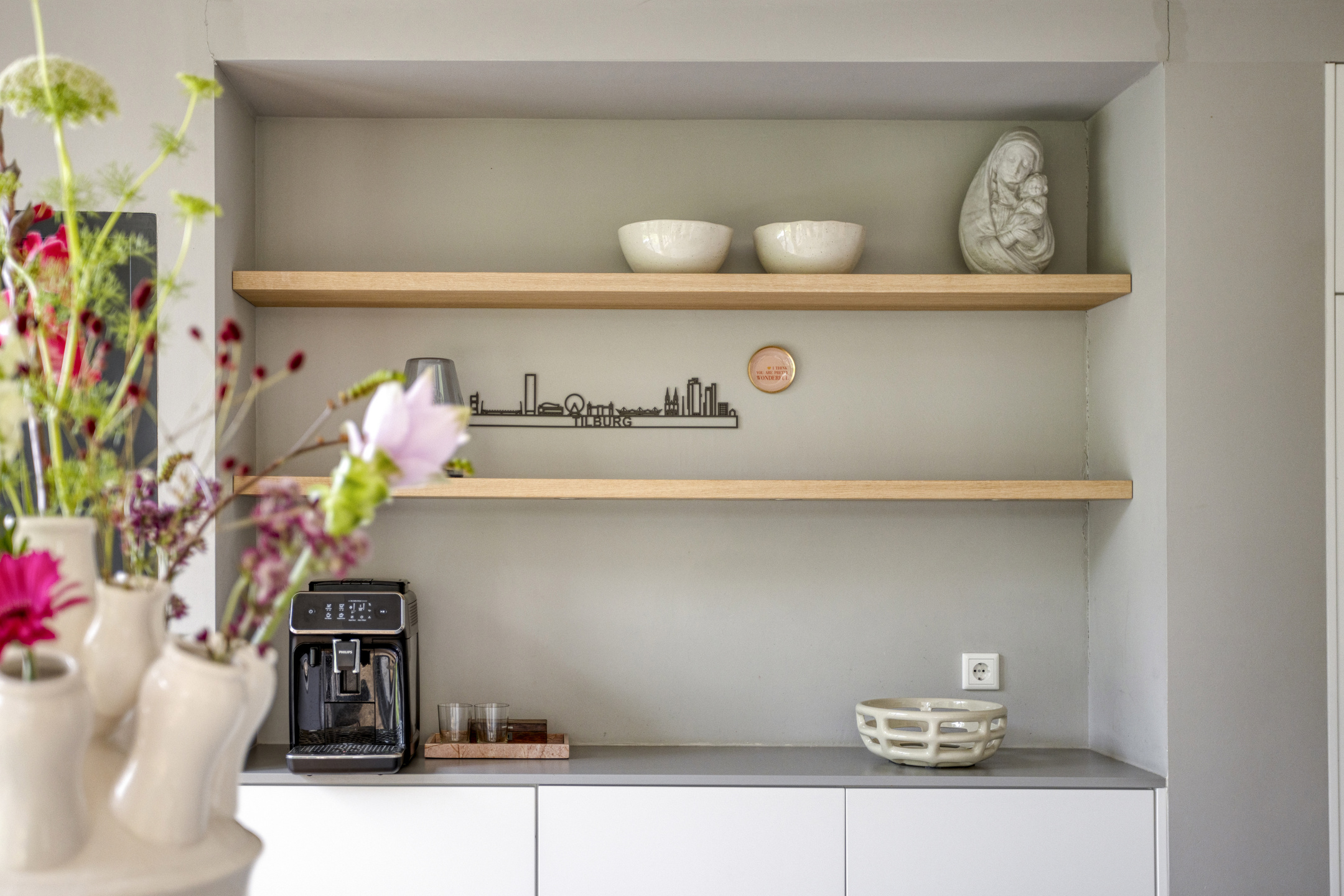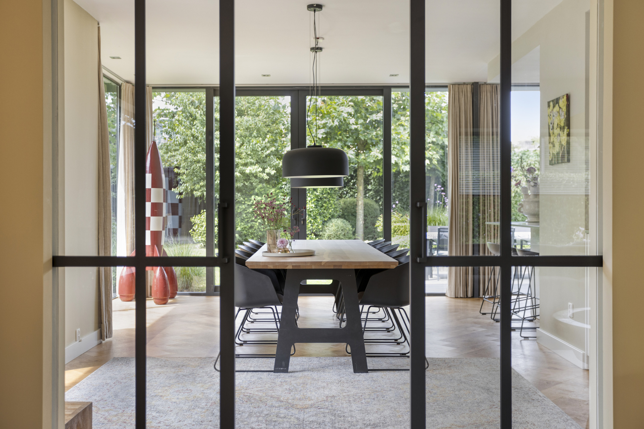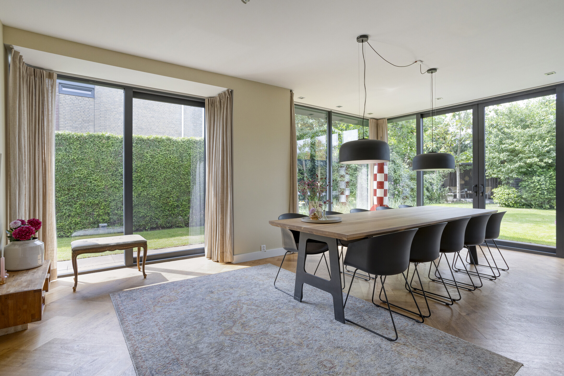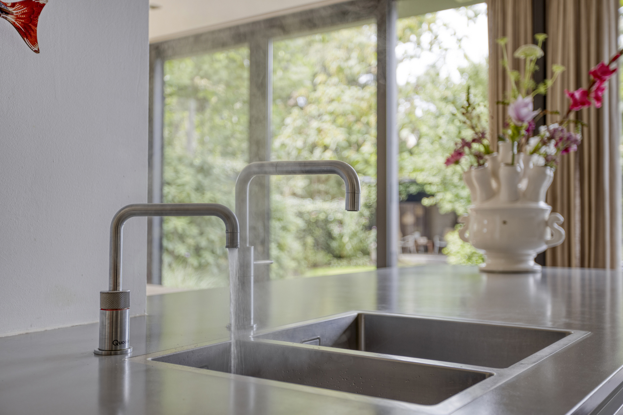 Keuken als middelpunt van het huis De woonkeuken is een lichte, ruime plek waar binnen en buiten moeiteloos in elkaar overvloeien. Twee grote schuifpuien verbinden de keuken direct met de tuin, waardoor deze ruimte aanvoelt als een natuurlijk verlengde van het buitenleven. De keuken is praktisch en ruim opgezet, met een rank werkblad, veel werkruimte en opvallend veel kastruimte in de vorm van lades en kasten, ook aan de achterzijde van het eiland. Aan het eiland staan barkrukken. Hier wordt gekookt, gezeten en geleefd. De inrichting is afgestemd op intensief gebruik, met hoogwaardige inbouwapparatuur zoals twee ovens (waaronder een hogedrukstoomoven), een biofresh-koelkast, een inductiekookplaat met geïntegreerde afzuigkap die ondergronds naar buiten afzuigt. Twee Quookers: één voor kokend water, één voor warm en koud. De vloer is van eikenhout; tussen het kookeiland en de wand met apparatuur liggen tegels. De benedenverdieping is in 2024 opnieuw geschilderd; een van de voorbeelden van de zorg waarmee het huis is onderhouden.