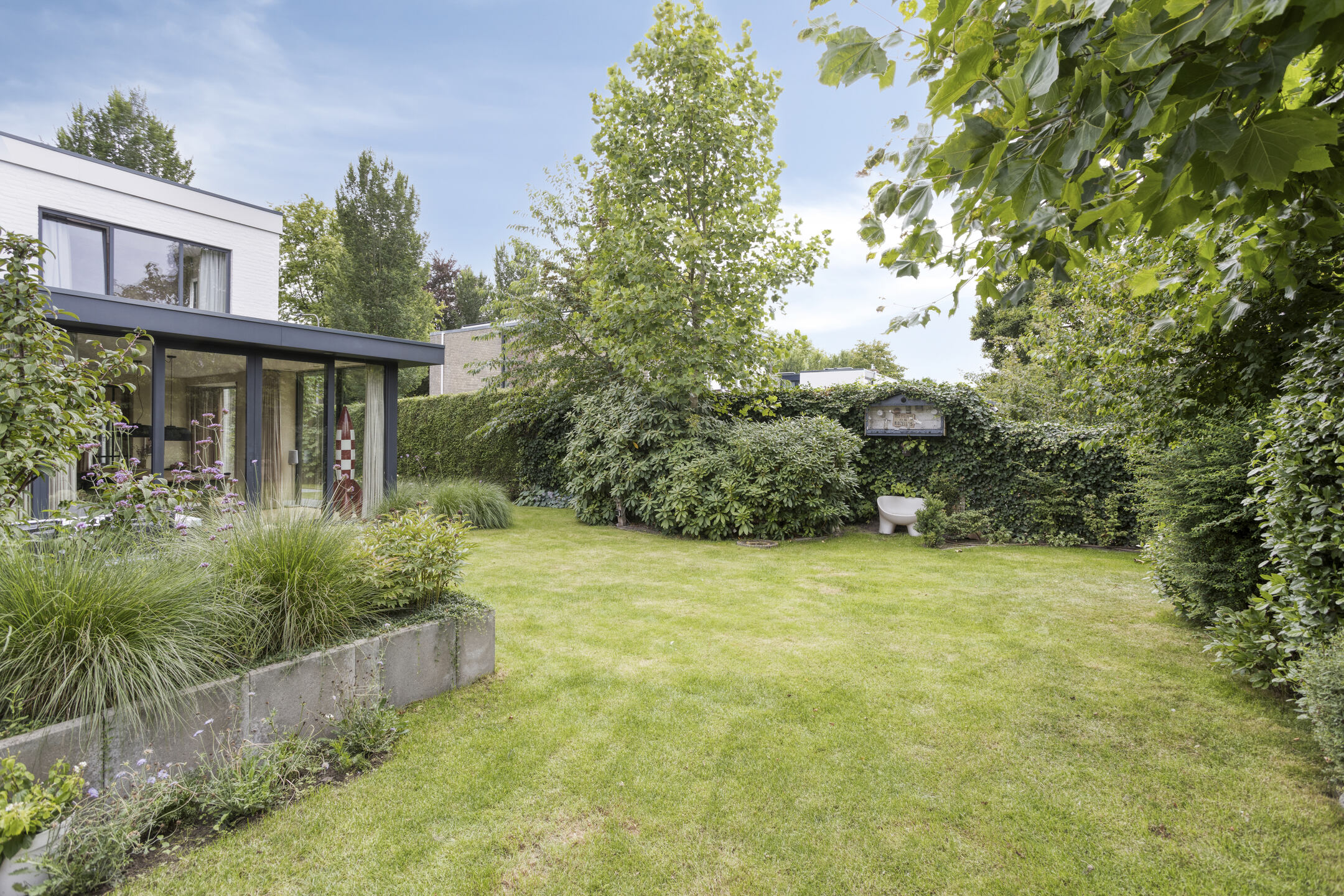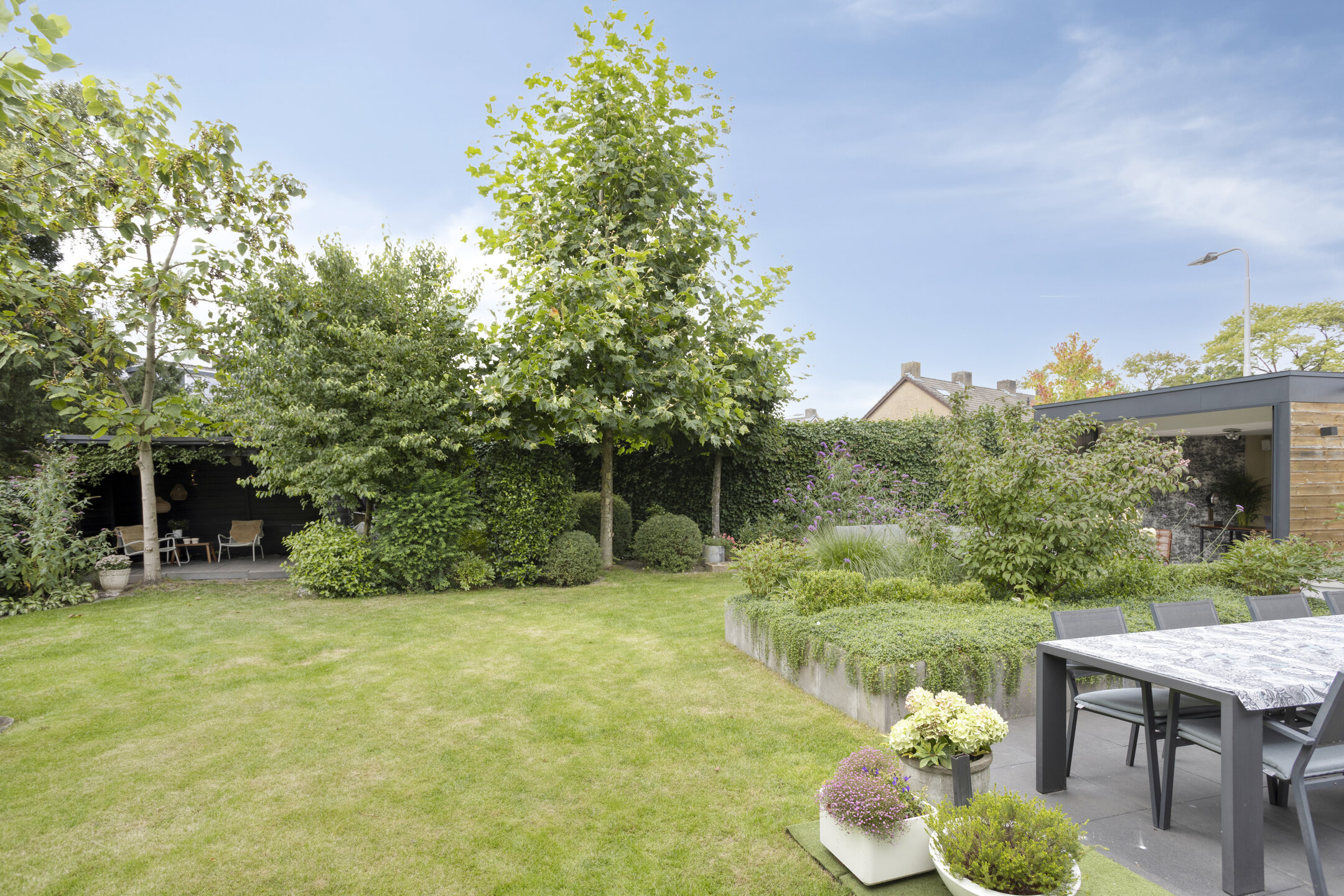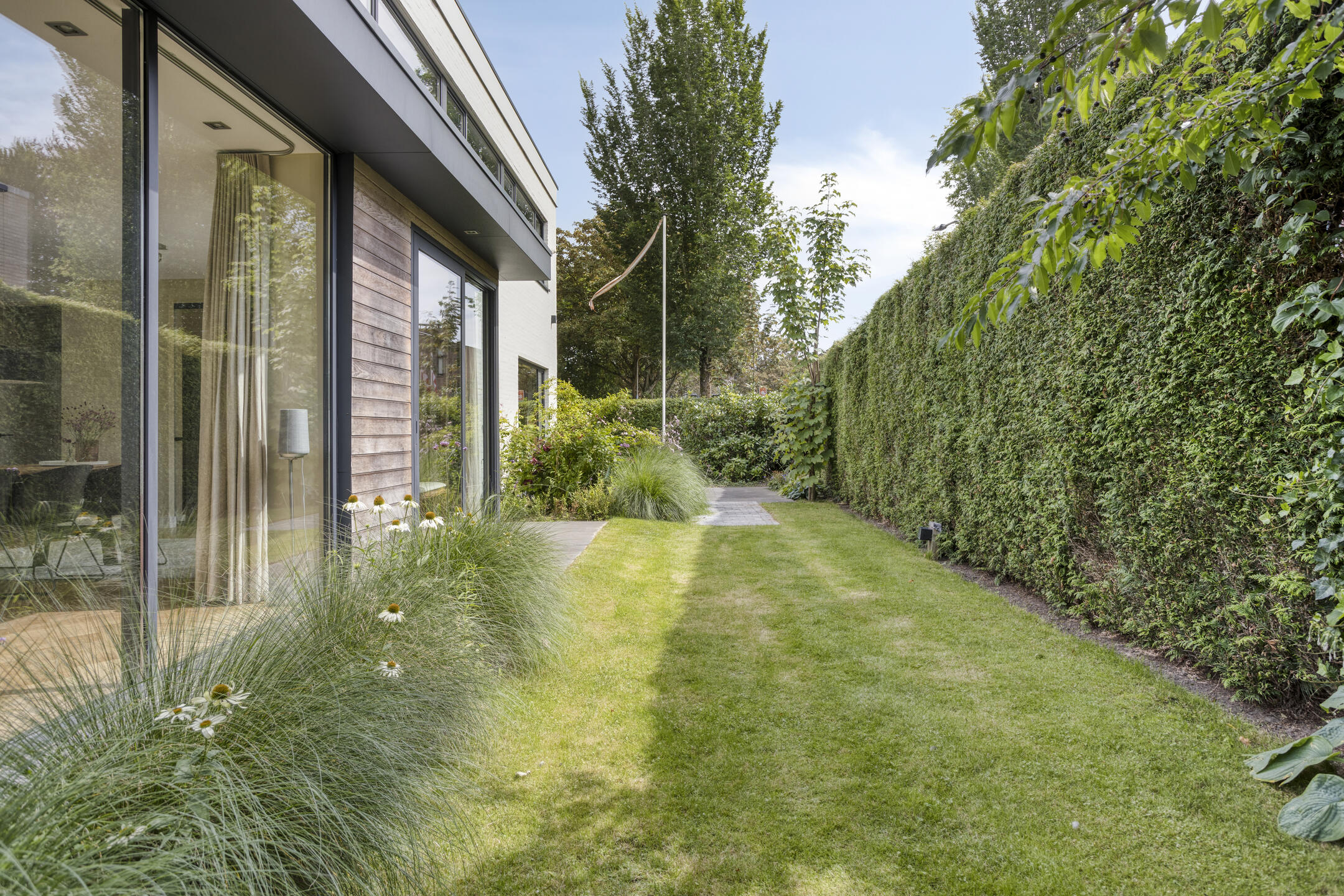 Groene tuin met zon, privacy en ruimte De tuin is vijf jaar geleden opnieuw aangelegd en voelt als een verlengstuk van de woning. Het is een groene oase waarin elk seizoen wel iets bloeit en elk hoekje iets anders laat zien. Er is zon op elk moment van de dag: ’s ochtends koffie aan de zijkant, ’s middags lunch bij de keuken, ’s avonds ontspannen bij de chillruimte of onder de overkapping achterin de tuin. Rododendrons en hortensia’s zorgen voor kleur, en volwassen hagen en bomen zorgen voor privacy en schaduw. Er is een open berging voor extra tuingereedschap en een sproei-installatie op grondwater. Aan de achterzijde grenst het perceel aan een autoluw plein waar kinderen naar hartenlust kunnen spelen.