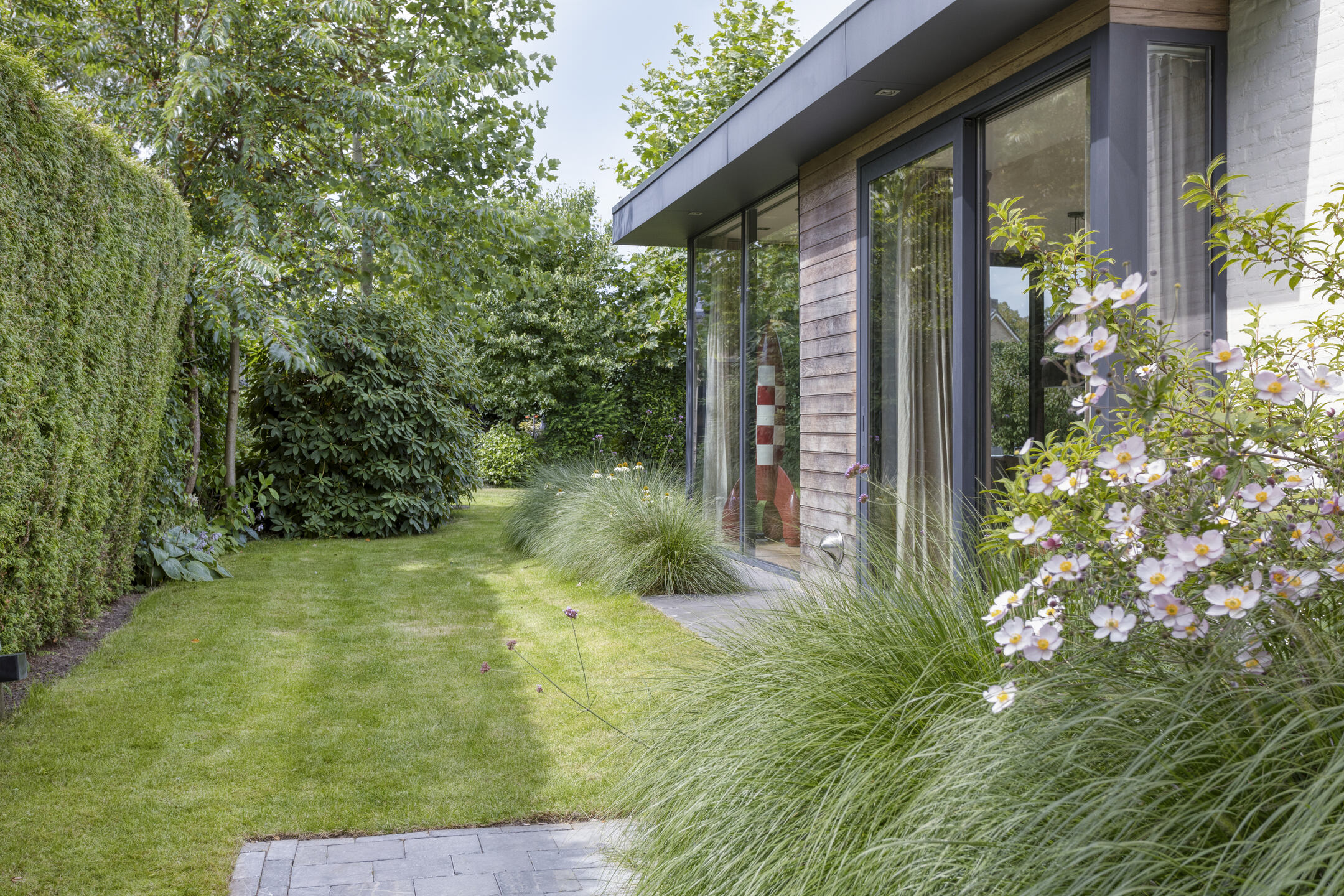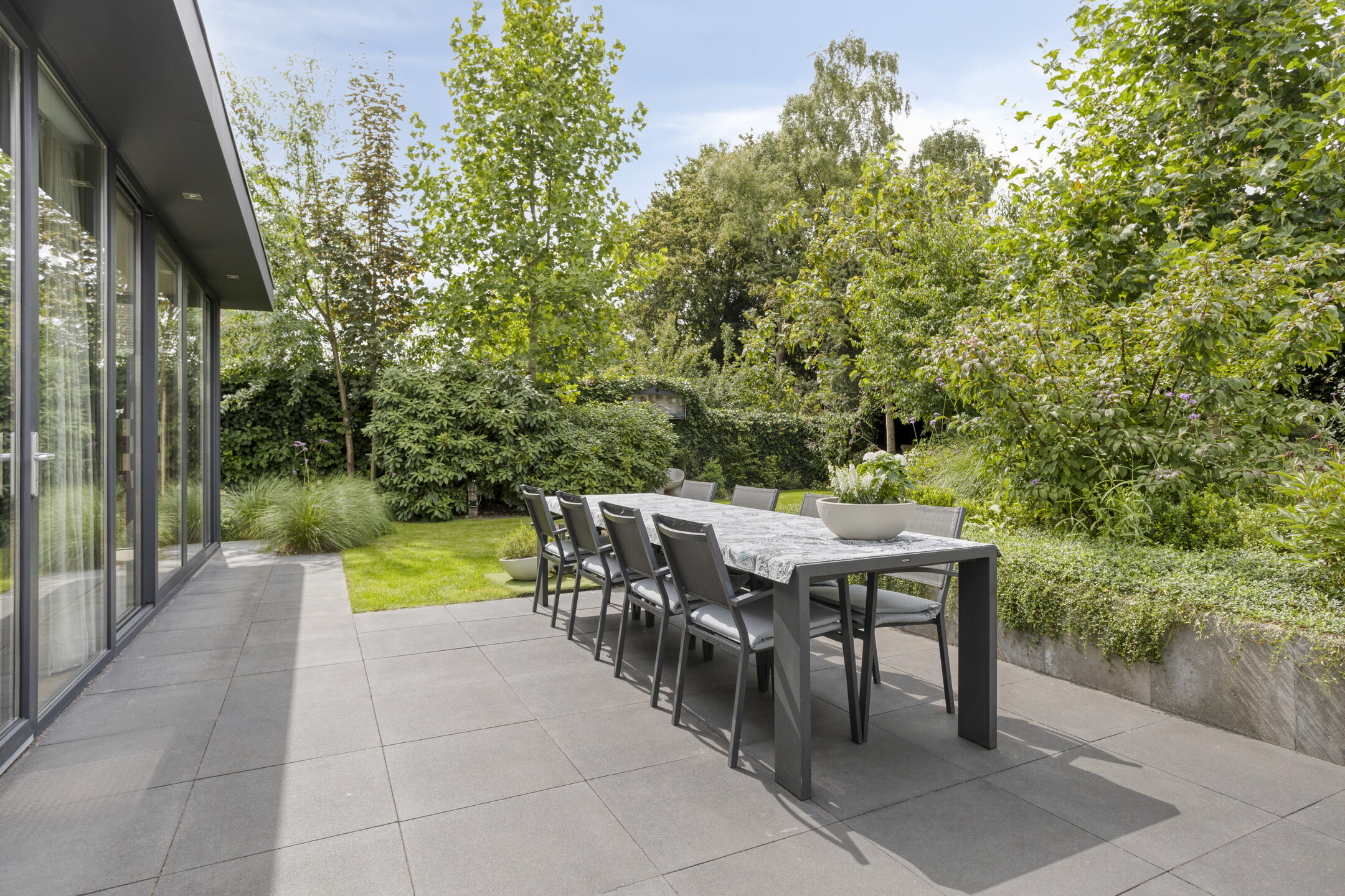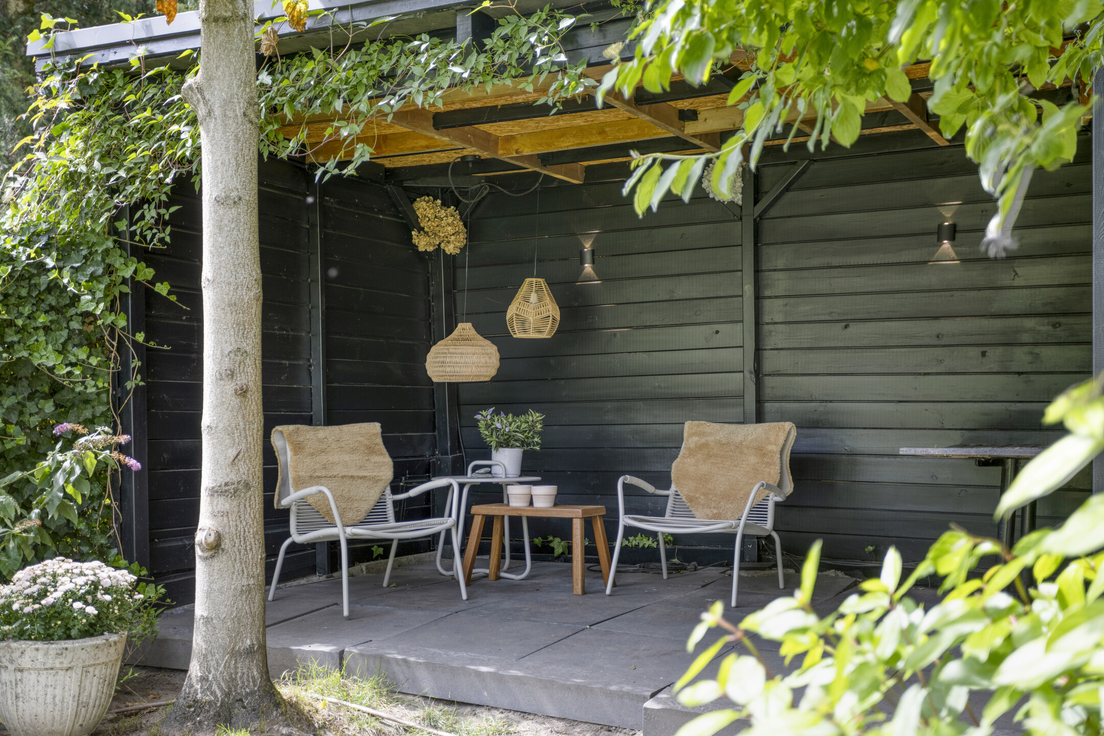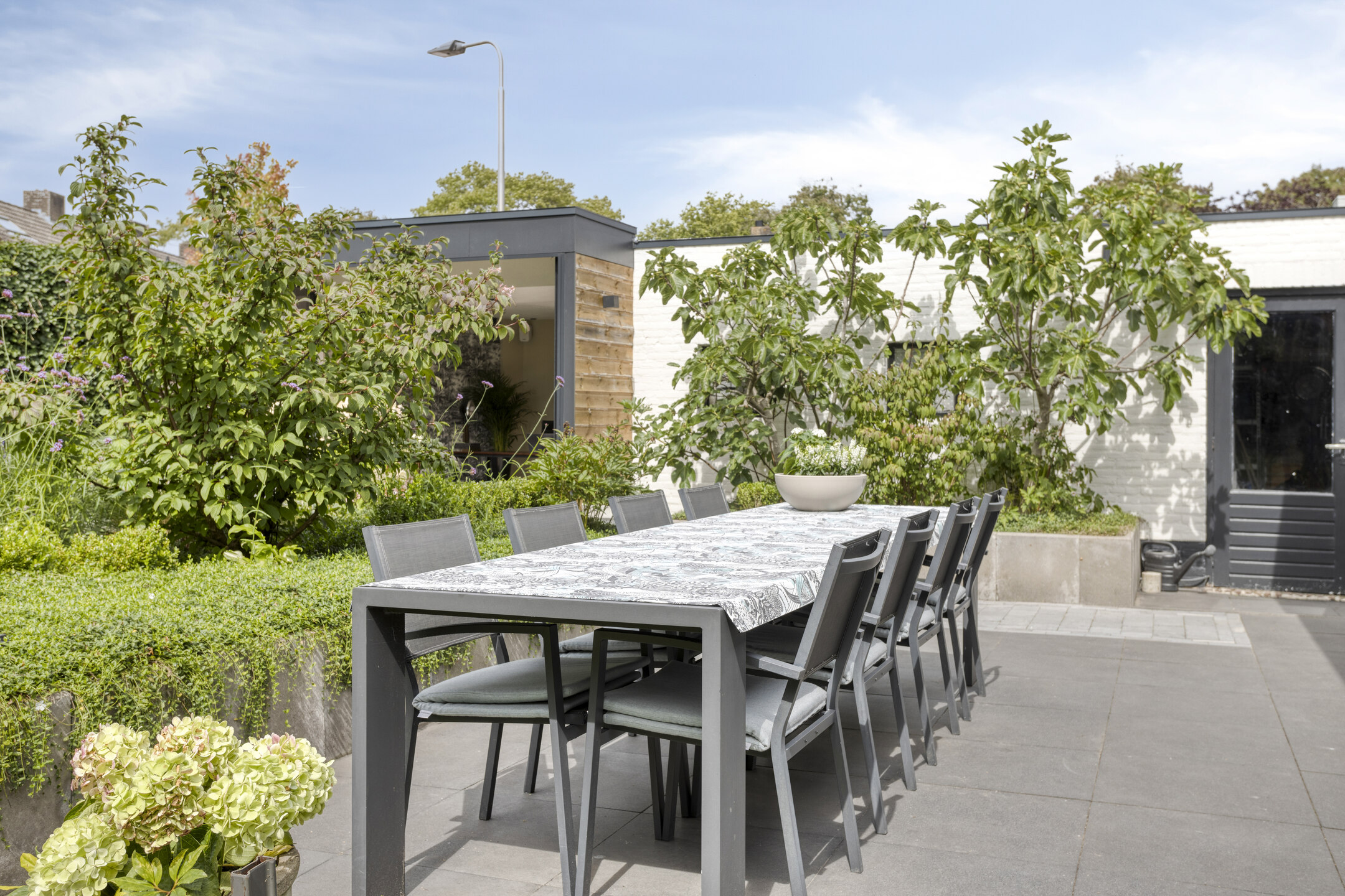 Groene tuin met zon, privacy en ruimte De tuin is vijf jaar geleden opnieuw aangelegd en voelt als een verlengstuk van de woning. Het is een groene oase waarin elk seizoen wel iets bloeit en elk hoekje iets anders laat zien. Er is zon op elk moment van de dag: ’s ochtends koffie aan de zijkant, ’s middags lunch bij de keuken, ’s avonds ontspannen bij de chillruimte of onder de overkapping achterin de tuin. Rododendrons en hortensia’s zorgen voor kleur, en volwassen hagen en bomen zorgen voor privacy en schaduw. Er is een open berging voor extra tuingereedschap en een sproei-installatie op grondwater. Aan de achterzijde grenst het perceel aan een autoluw plein waar kinderen naar hartenlust kunnen spelen.