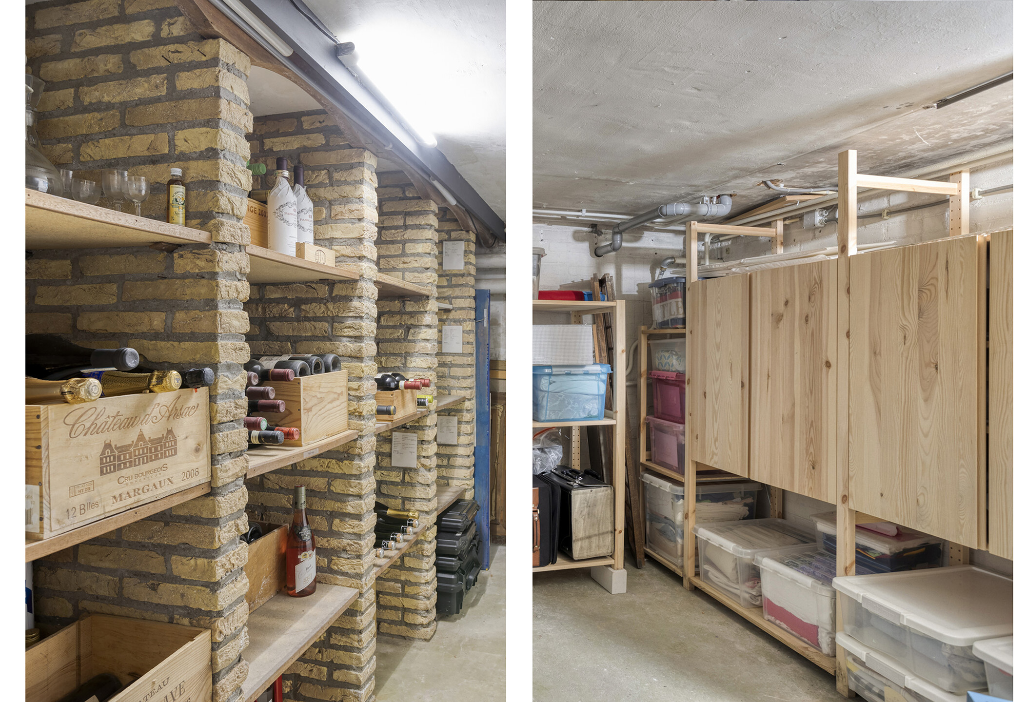 De zeer ruime kelder is een praktische toevoeging: verrassend ruim en veelzijdig in gebruik. Deze verdieping doet dienst als wijnkelder, opslag en technische ruimte. Het vervult in dit huis de rol van zolder – met plek voor voorraad, apparatuur en een extra vriezer.