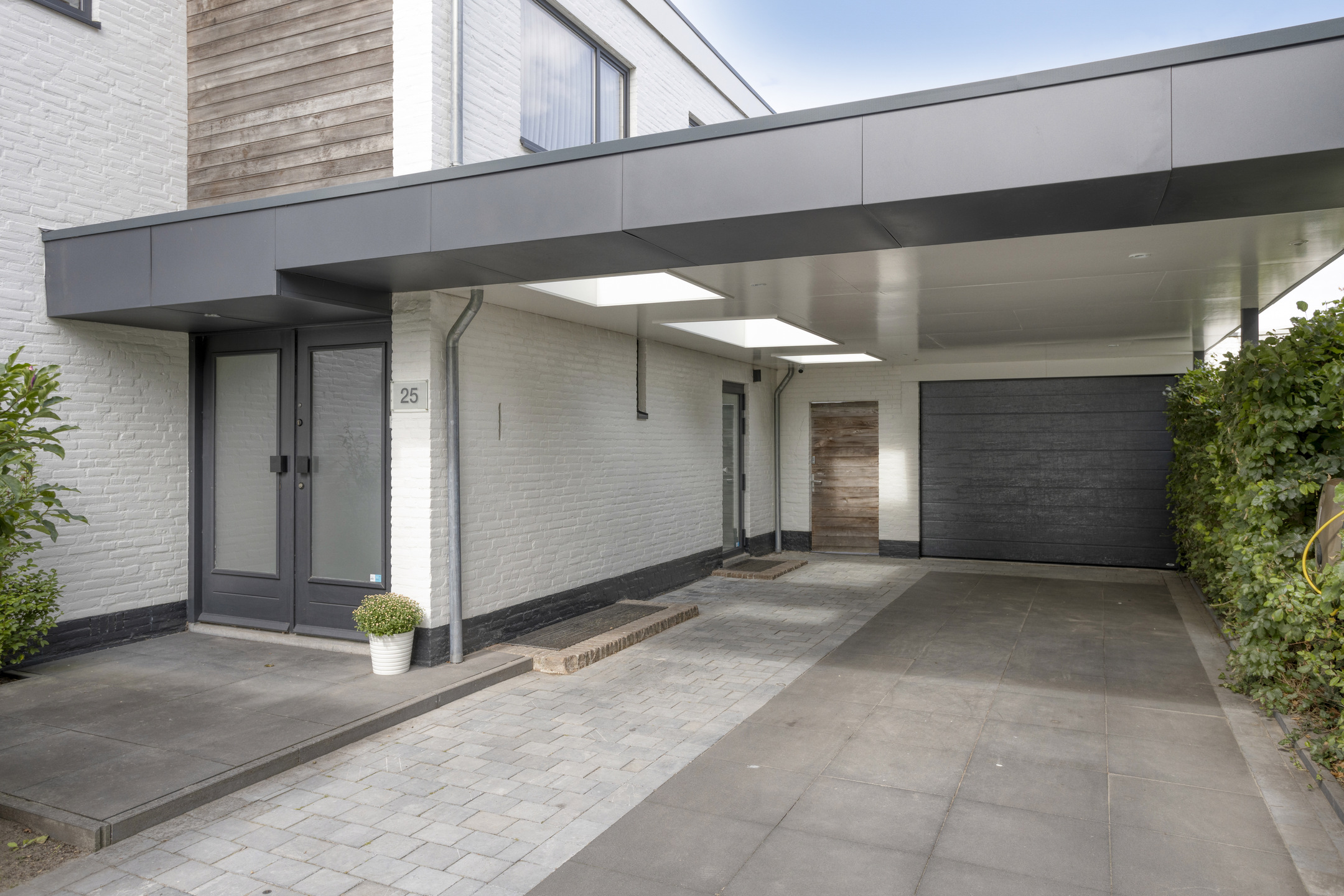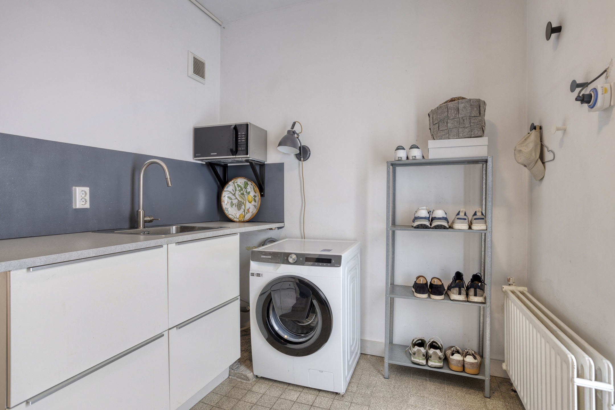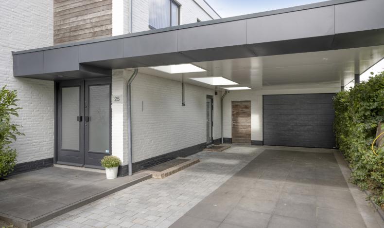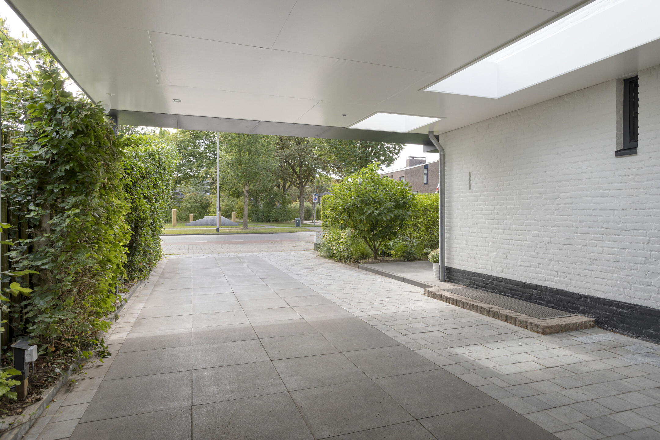 Slimme ruimtes met verrassend veel gebruiksgemak De bijkeuken is in de praktijk de meest gebruikte entree. Hier vind je drie ingebouwde kasten voor schoenen, sportspullen en voorraad, opstelling voor de wasmachine en een oorspronkelijke kluis. Vanuit hier loop je door naar de carport (2024), die qua vorm en materiaalgebruik aansluit bij het ontwerp van het huis. Rondom de entree is camerabewaking aangebracht.