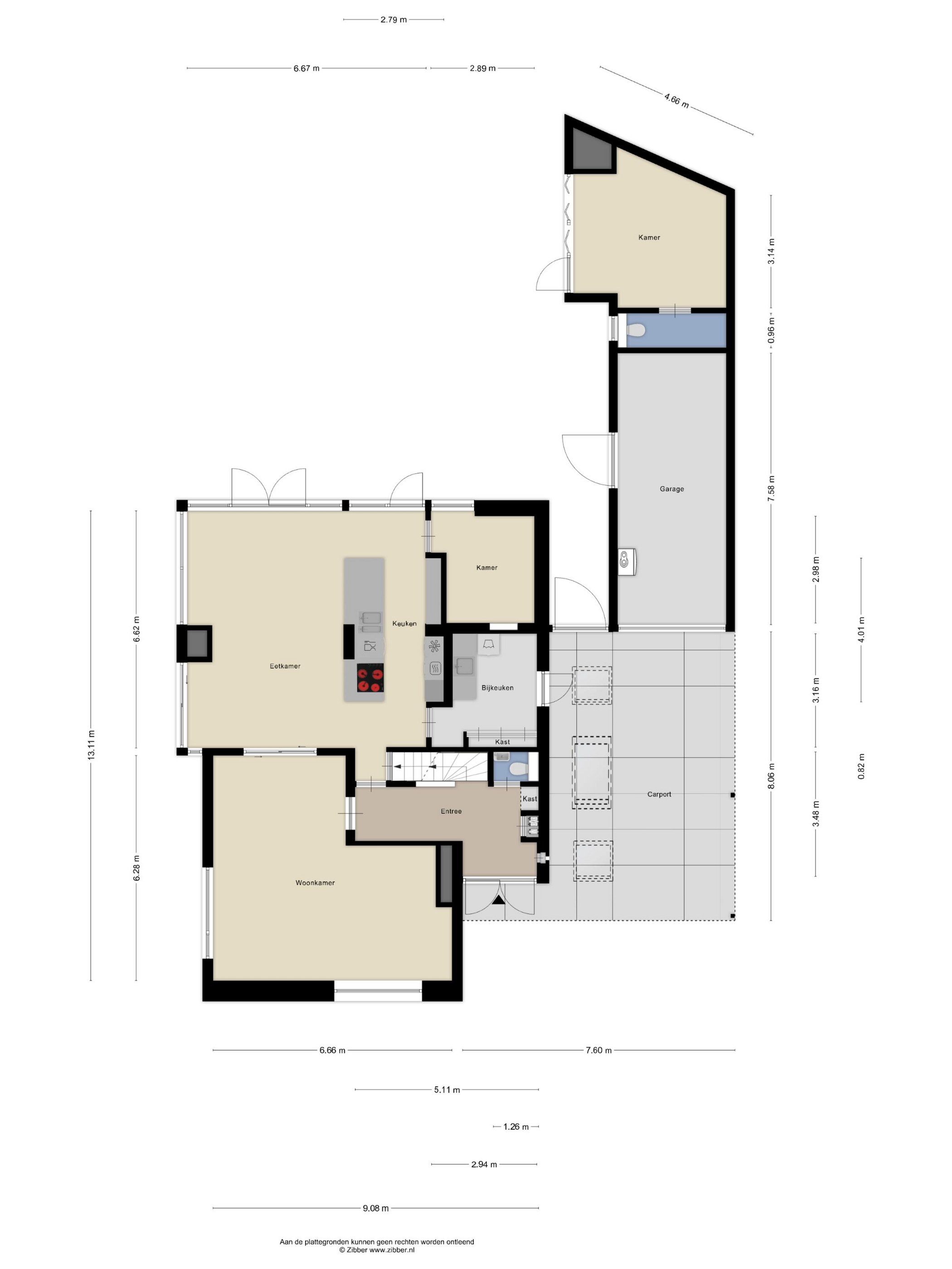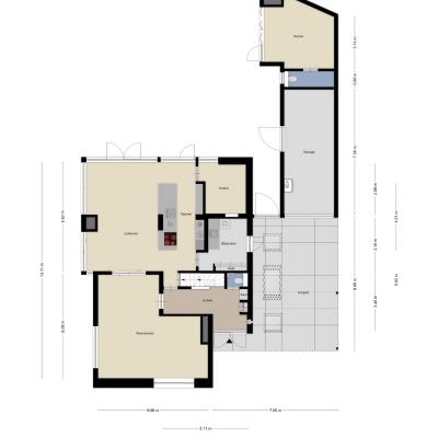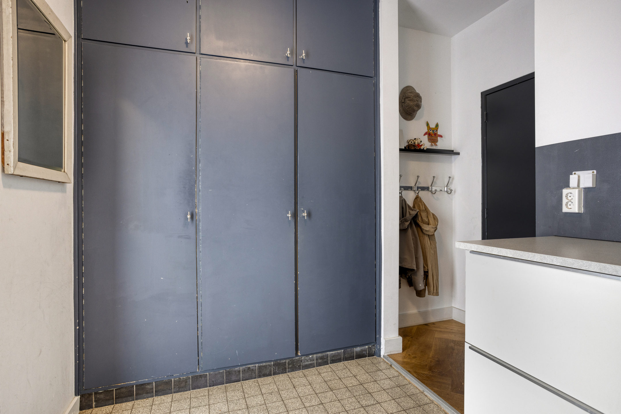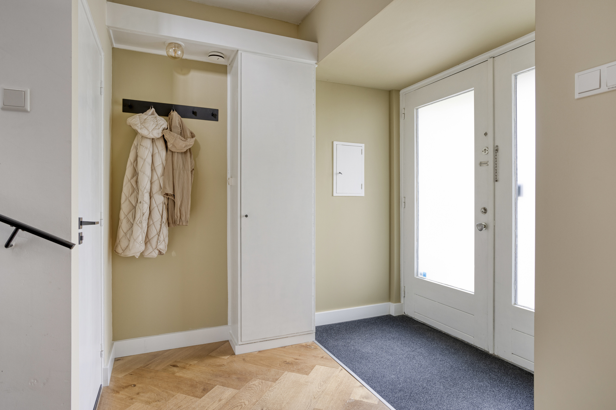 Slimme ruimtes met verrassend veel gebruiksgemak De bijkeuken is in de praktijk de meest gebruikte entree. Hier vind je drie ingebouwde kasten voor schoenen, sportspullen en voorraad, opstelling voor de wasmachine en een oorspronkelijke kluis. Vanuit hier loop je door naar de carport (2024), die qua vorm en materiaalgebruik aansluit bij het ontwerp van het huis. Rondom de entree is camerabewaking aangebracht.