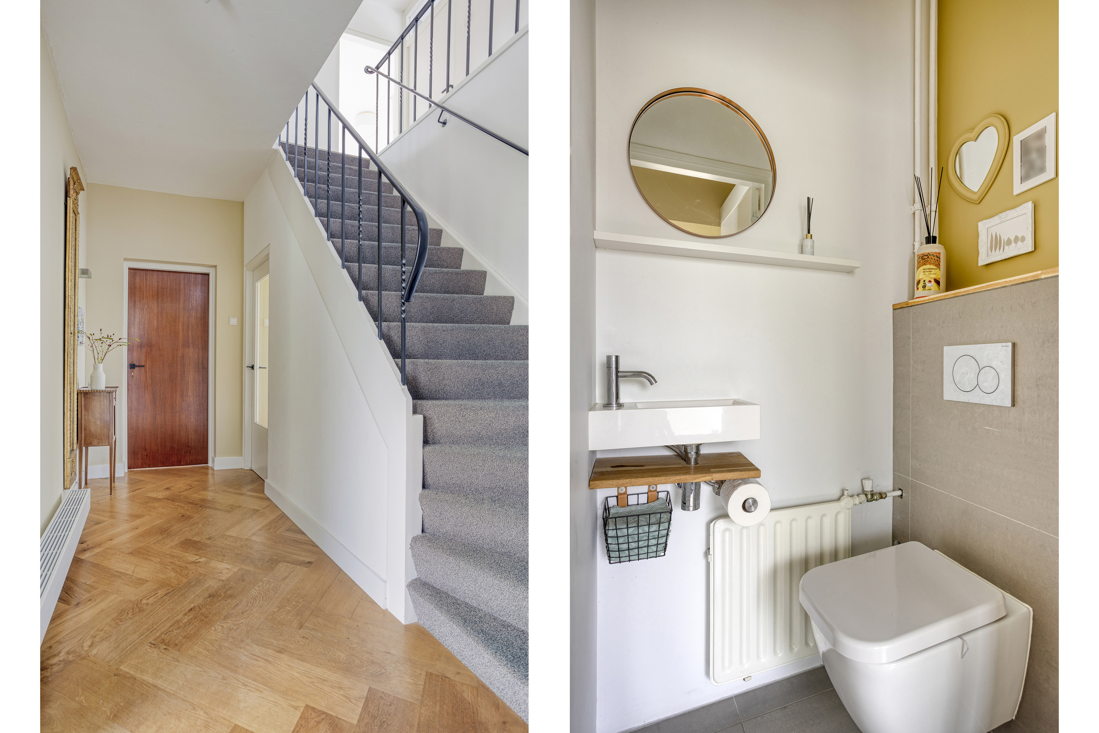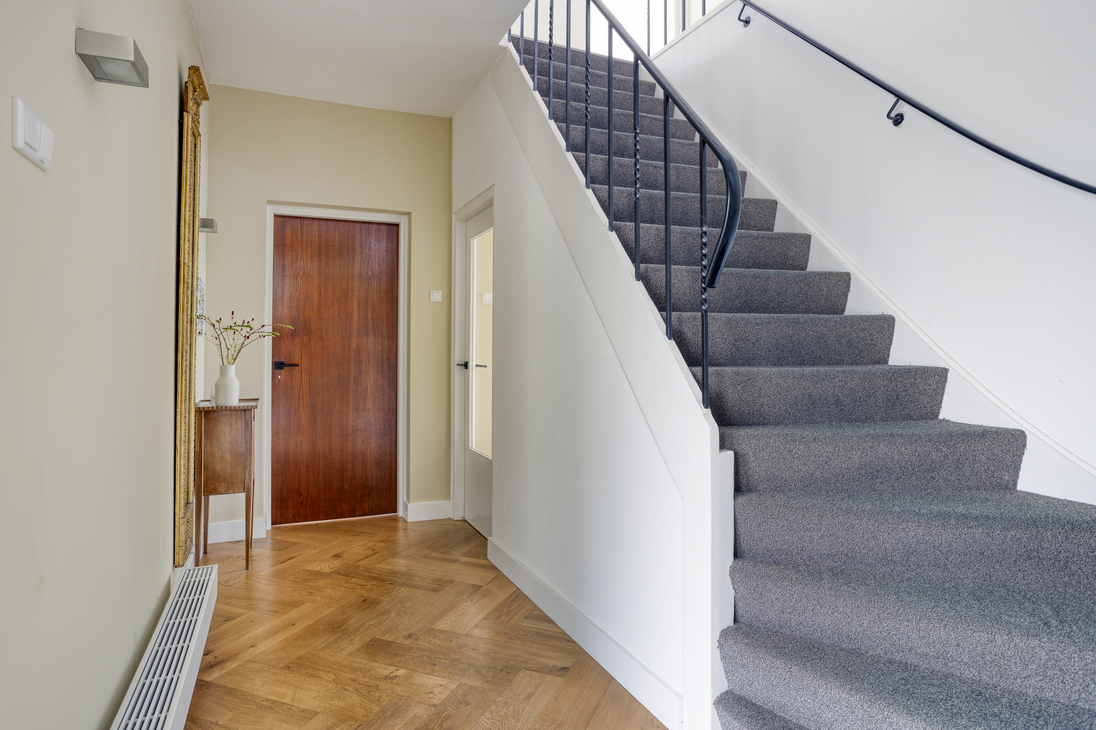 Ruimtelijkheid die buiten opvalt, zet zich voort zodra je binnenstapt. In de hal trekken de dubbele voordeur, het hoge plafond en de open trap direct de aandacht. De indeling is praktisch: hier bevinden zich het toilet, de garderobe en de meterkast. De woonkamer aan de voorzijde is royaal en licht, en heeft een open haard die in een handomdraai in oorspronkelijke staat terug te brengen is. Dankzij ensuite deuren is de woonkamer afsluitbaar, wat het huis flexibel maakt voor verschillende momenten van de dag. ’s Avonds wordt hier vaker de rust opgezocht, terwijl het dagelijks leven zich overdag vooral aan de tuinzijde afspeelt. Hier vormt de woonkeuken namelijk het kloppend hart van het huis. Onder de houten vloer op de begane grond ligt comfortabele vloerverwarming.