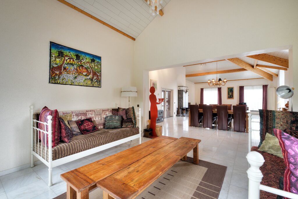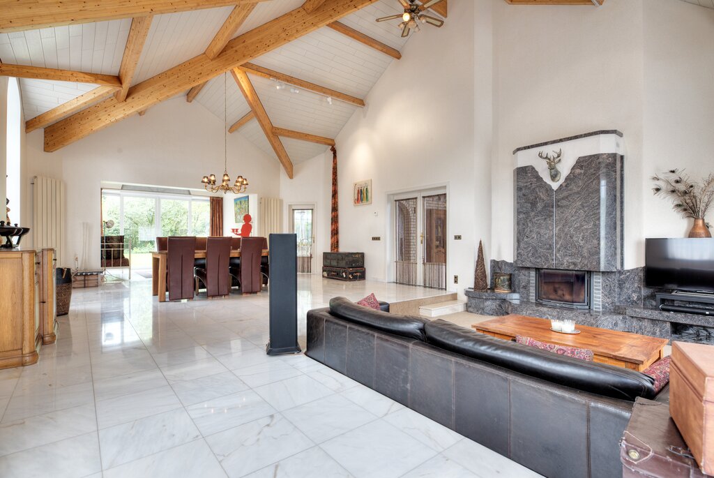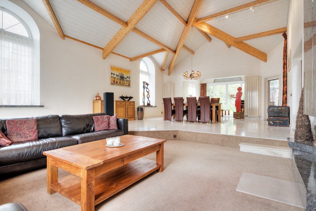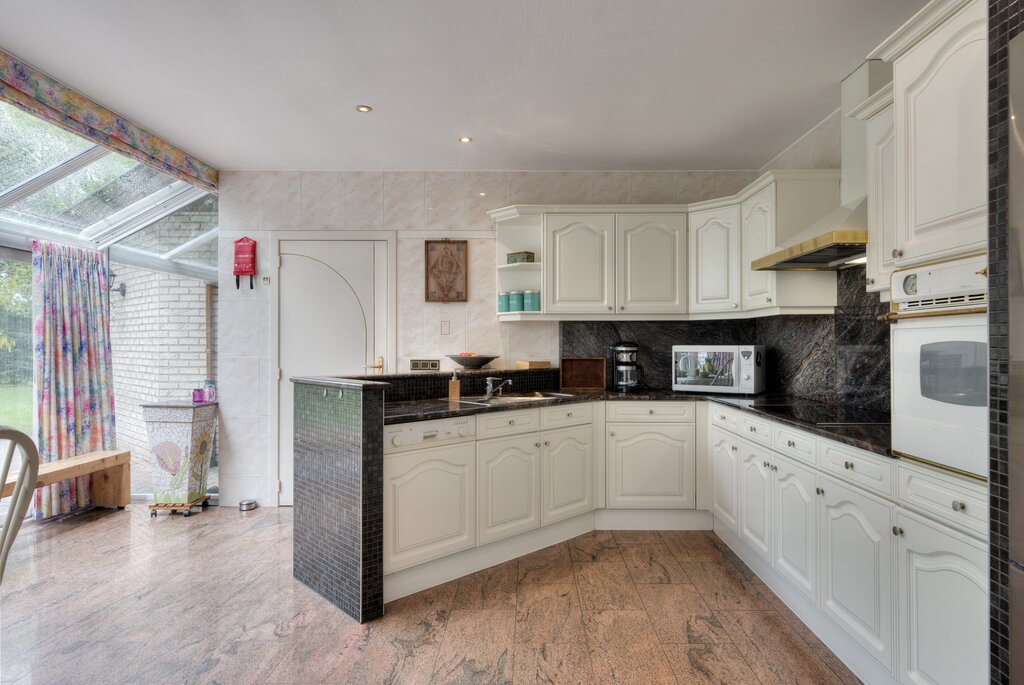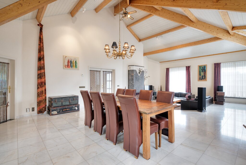 U betreedt de woning via de entree met travertinvloer, vestiaire en gastentoilet met urinoir. Links van de entree bevindt zich de ruime woonkamer (ca.67,2m²) met witte marmeren vloer en gezellige houtkachel waarvan de schoorsteen extra ventilatoren heeft om warmte af te geven. Aan de woonkamer bevindt zich een gezellige zitruimte (veranda van ca. 18,04m²) met mooi zicht in eigen tuin. Vanuit de woonkamer heeft u toegang tot de ruime keuken met granieten vloer. Deze geniet veel natuurlijk daglicht door de grote raampartijen. De keuken is voorzien van de nodige inbouwapparatuur en handige inbouwkasten. De slaapkamers zijn eveneens ruim en voorzien van ensuite badkamers. De masterbedroom (ca. 20m²) is voorzien van inbouwkasten en elektrische rolluiken. Er zijn 2 badkamers: ensuite badkamer masterbedroom is voorzien van een hoekbad, wastafel en toilet -ensuite badkamer van de 2 andere slaapkamers (ca.17m² en 14,11m²) is voorzien van douche, wastafel en toilet. Verder is er op de begane grond nog een waskamer voorzien en toegang naar de kelder (ca.27,54m²). De ruime inpandige garage (ca.40,34m²) heeft een elektrische deur. Vanuit de garage heeft u toegang tot de zolder(vide) die nog zeer veel opbergruimte biedt.