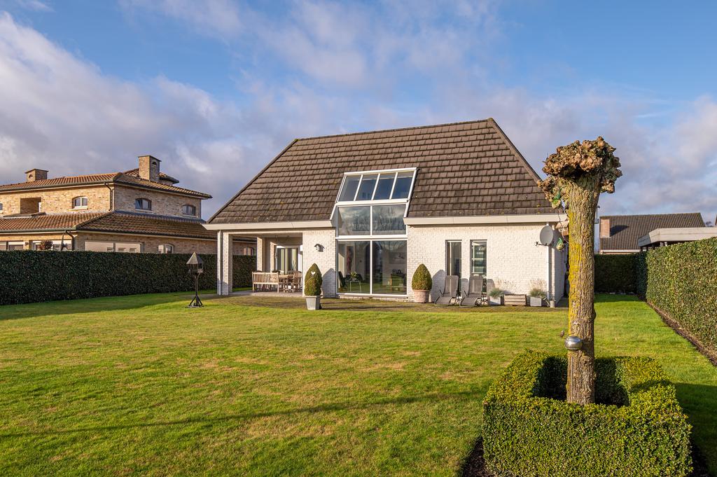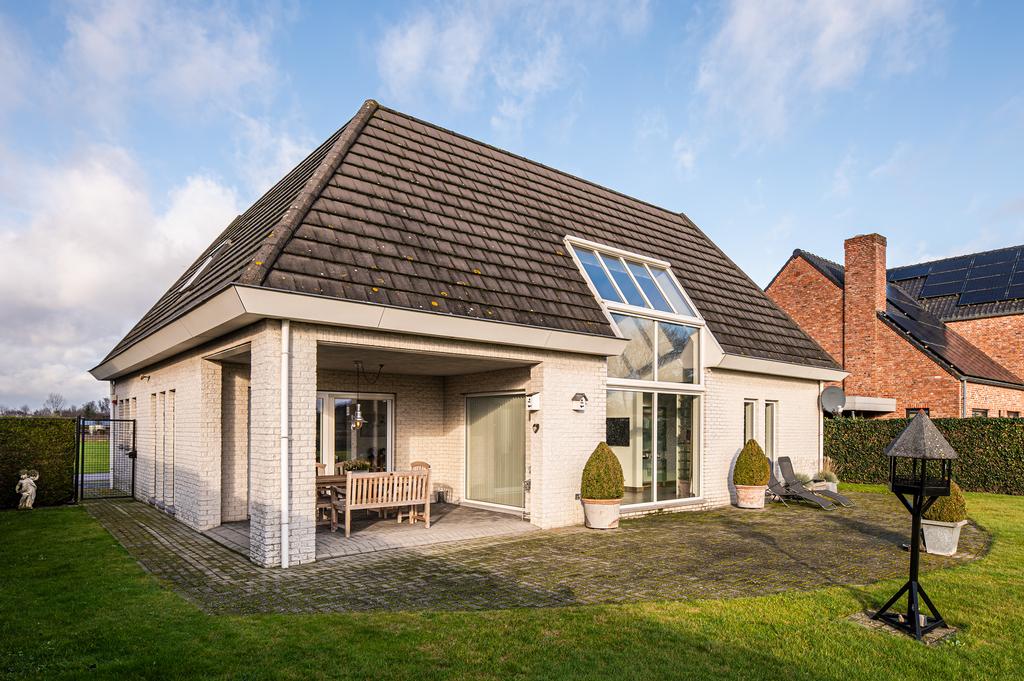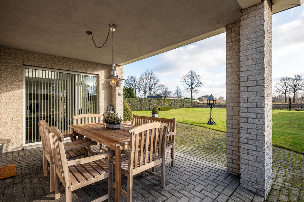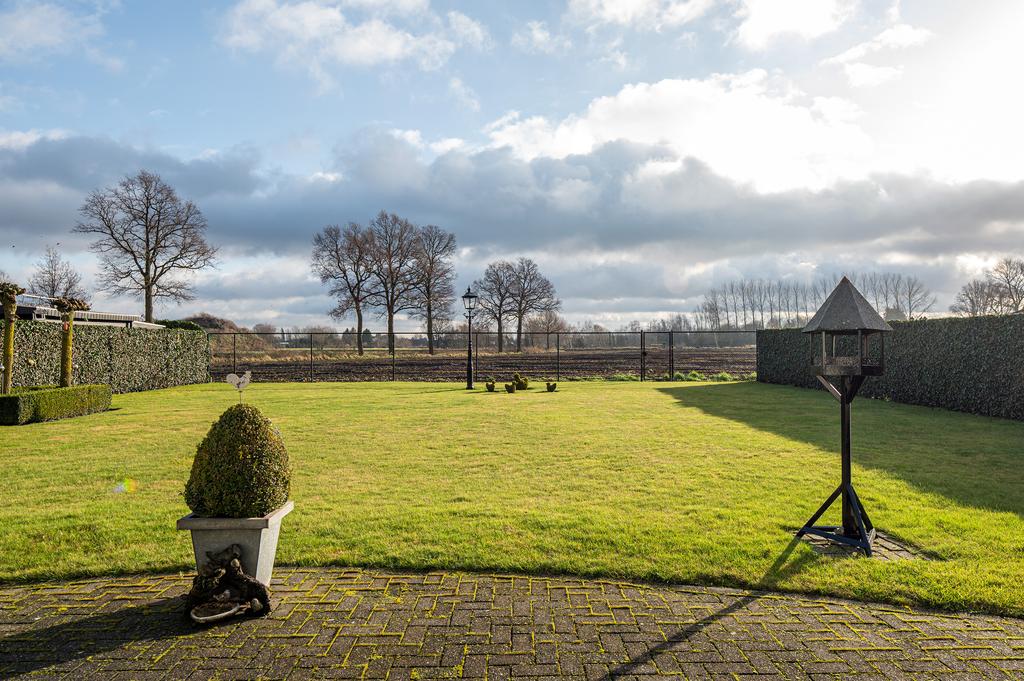 De mooi aangelegde tuin is volledig omheind en geniet van een geweldig uitzicht over achterliggende weilanden. Verder is er een overdekt terras bereikbaar via de recent vernieuwde schuifpui (voorzien van een plisséhor). De tuin is ideaal georiënteerd op het zuidoosten. De voorkant van de villa is voorzien van een royale bestraten oprit met siergrind, rondom de woning en in de tuin is tevens buitenverlichting voorzien.