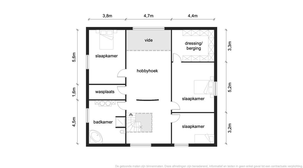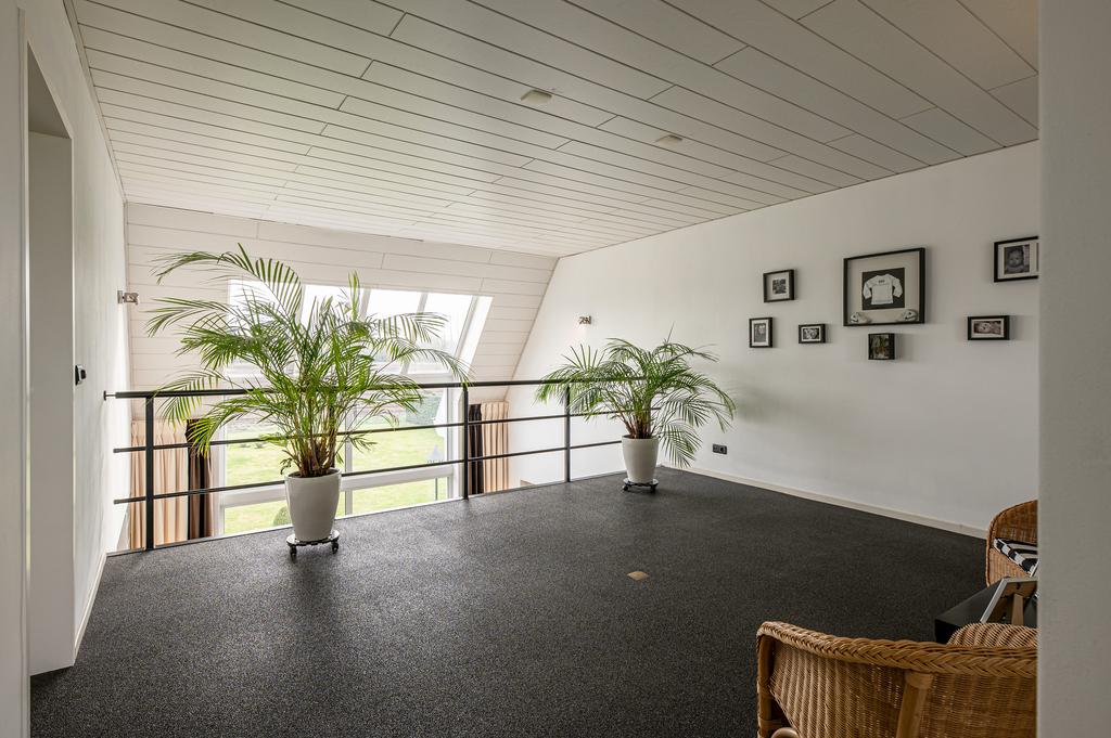 De vaste trap in de entree brengt u naar de eerste verdieping. Deze is voorzien van een riante vide die mogelijkheden biedt zoals bijvoorbeeld bureauruimte, hobby/speelruimte, biljarttafel of ... . Verder zijn er 3 slaapkamers voorzien waarvan de master bedroom een ensuite inloopkast heeft (waarbij geïntergreerde berging is voorzien). De riante badkamer is voorzien van een hoekbad, douche, toilet en hangend badkamermeubel met dubbele wastafel. Naast de badkamer bevindt nog een aparte ruimte (wasplaats) met aansluitingen voor was-en droogmachine.